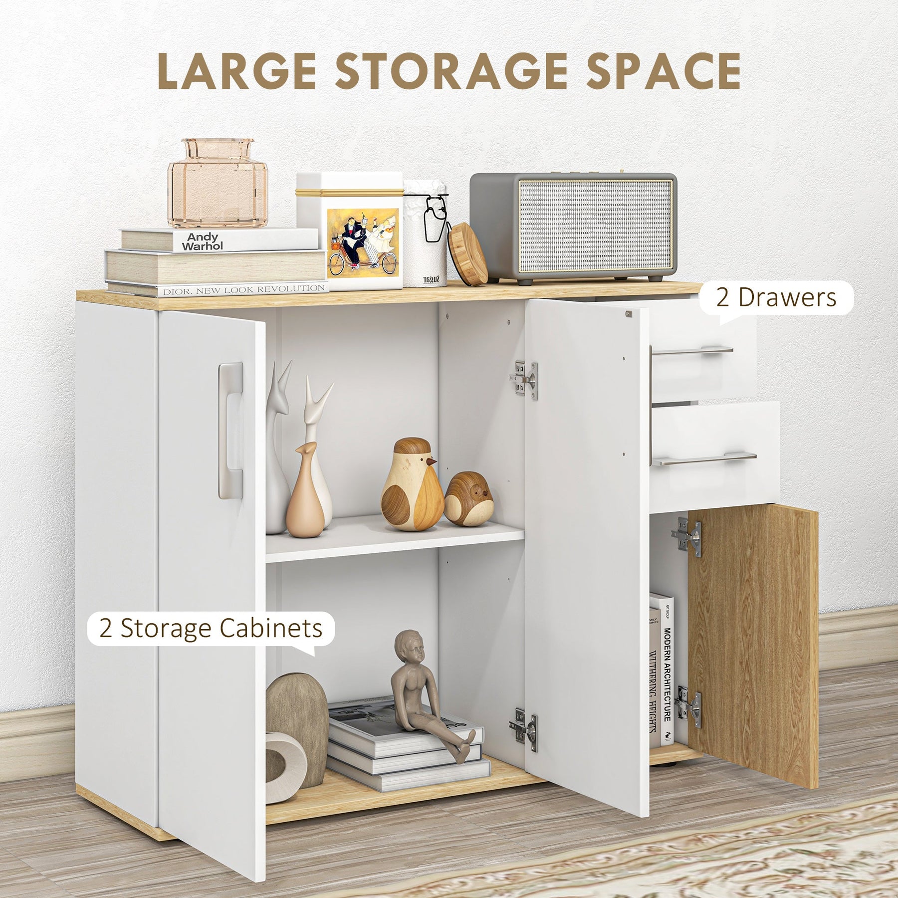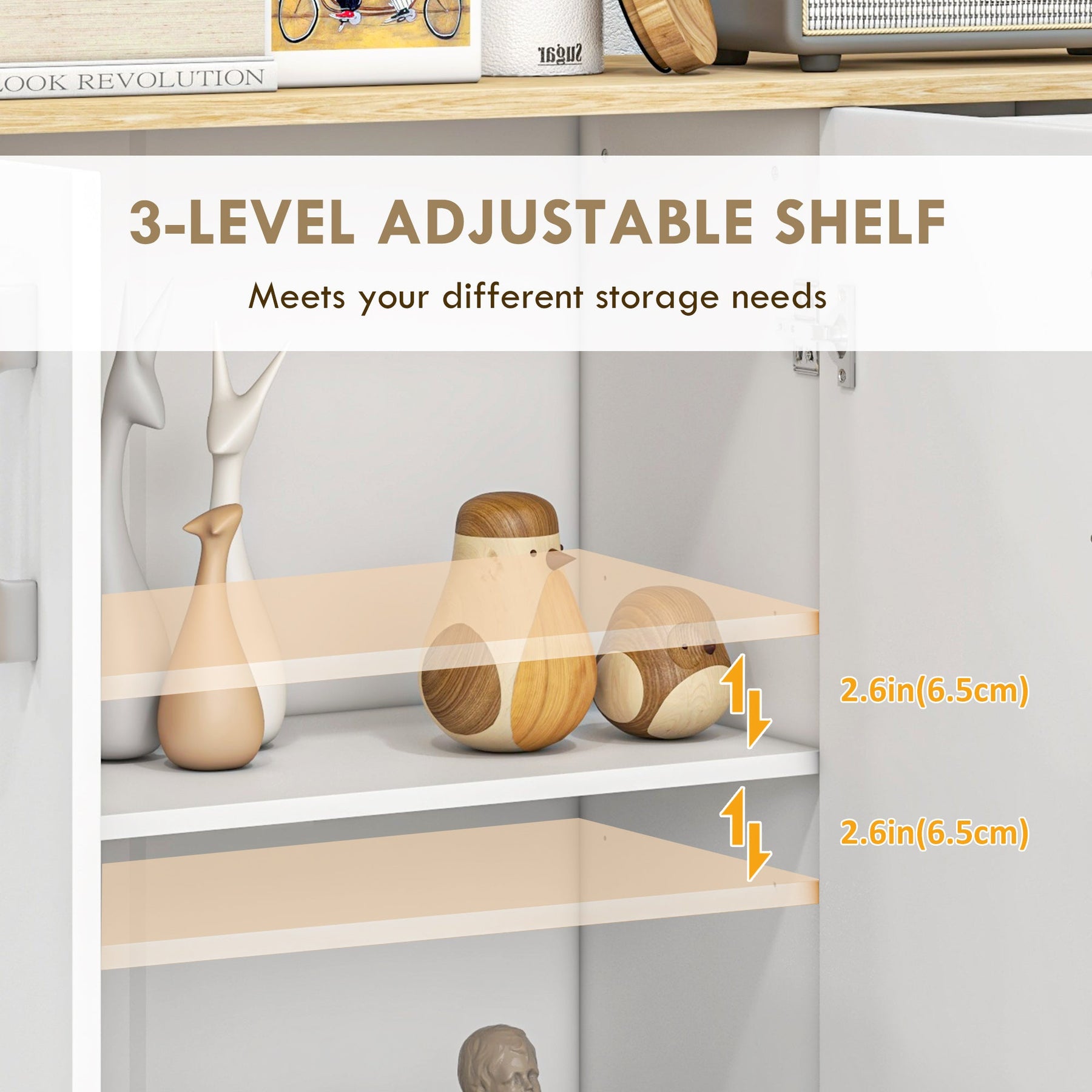 This multifunctional coffee bar cabinet combines style and practicality, featuring two-tone coloring and alloy handles for a sleek, understated look. Use the spacious top for serving dishes, while keeping your cooking utensils, spoons, and forks neatly tucked away in the two drawers and two cabinets. The cabinet also offers 3 levels of adjustable shelving, giving you the flexibility to store items of various sizes. The versatile design allows this storage unit to be used as a kitchen sideboard, coffee bar in the living room, or even as a bar area organizer for happy hour essentials. The solid particleboard construction ensures durability, while anti-tipping hardware and non-slip foot pads add extra safety and stability. The waterproof surface makes cleaning easy, ensuring this unit lasts for years.