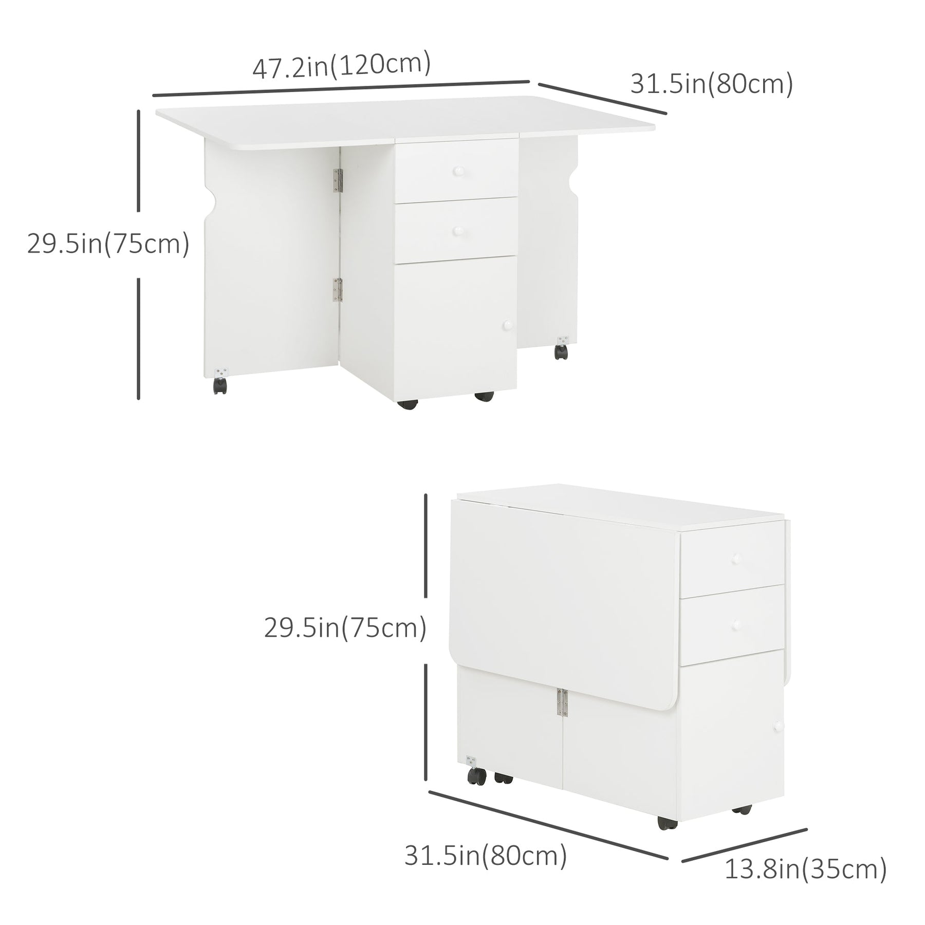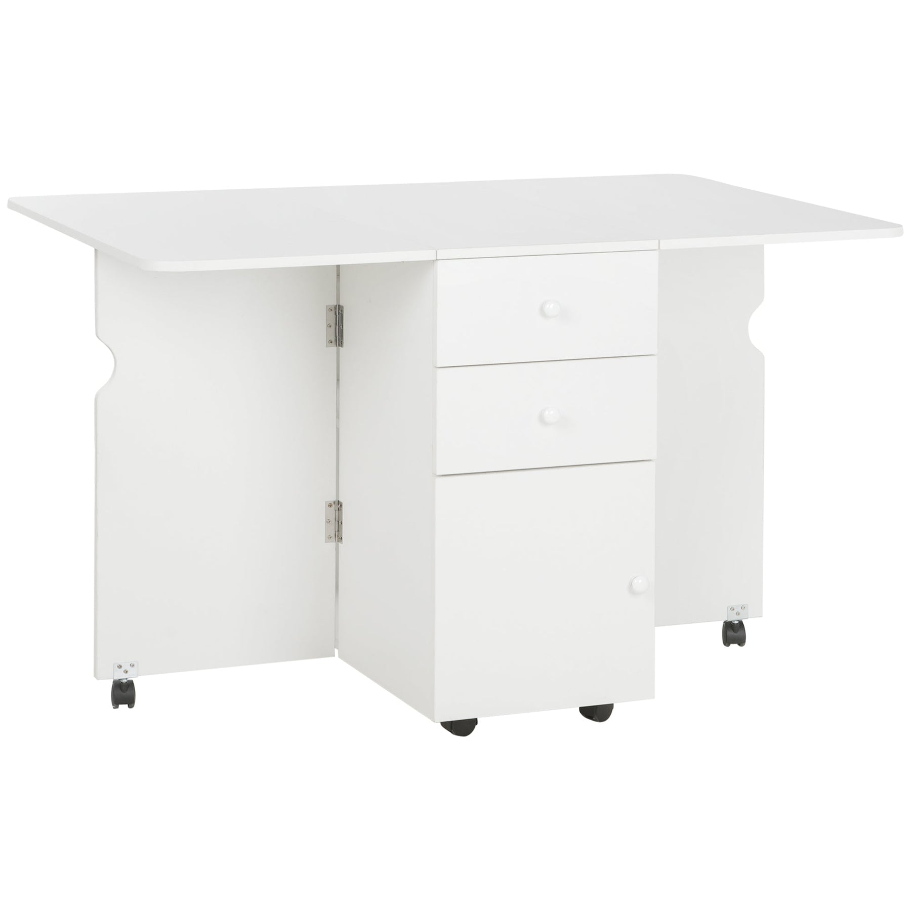 HOMCOM Extendable Drop Leaf Dining Table with 2 Drawers Cabinet 6 Wheels for Small Spaces Kitchen White