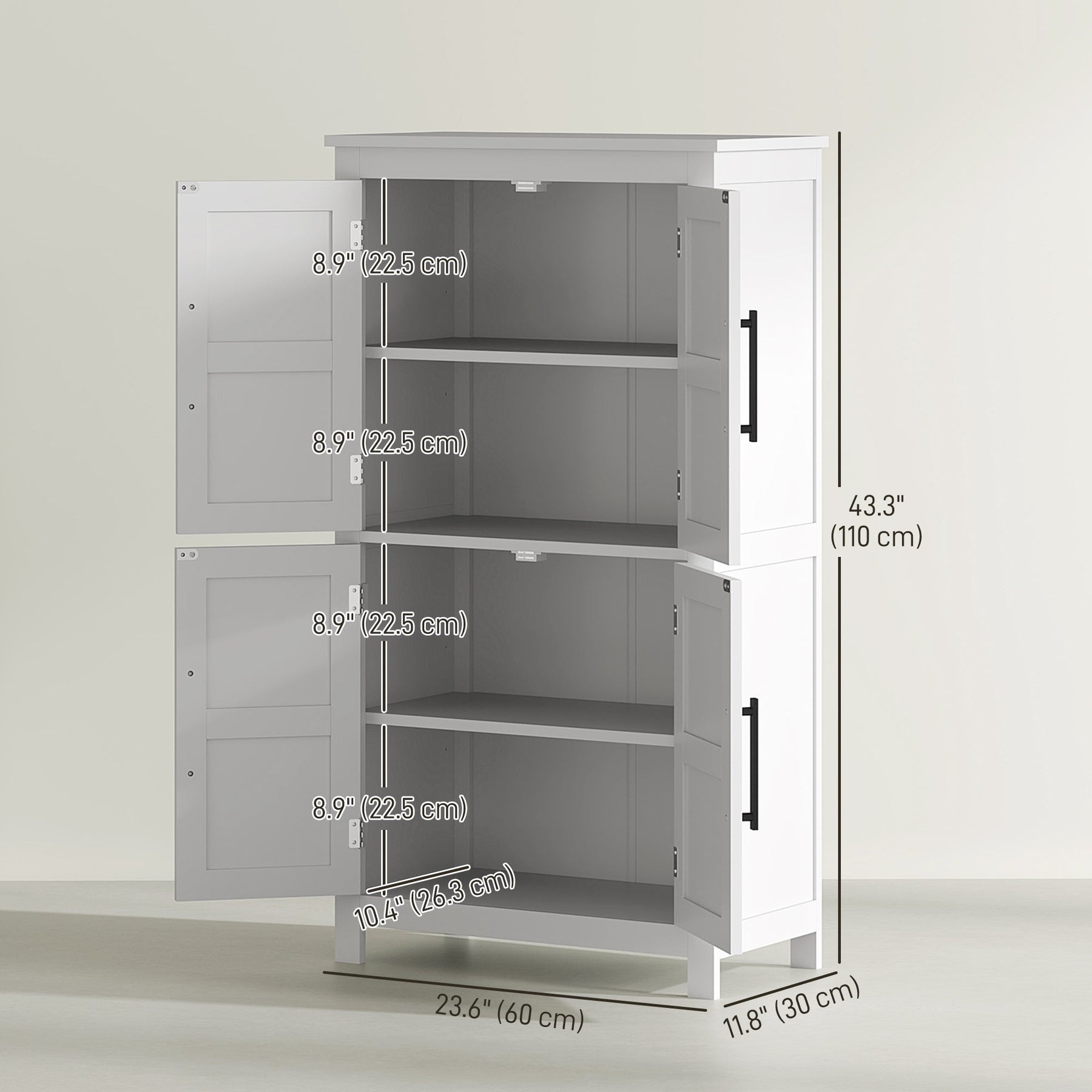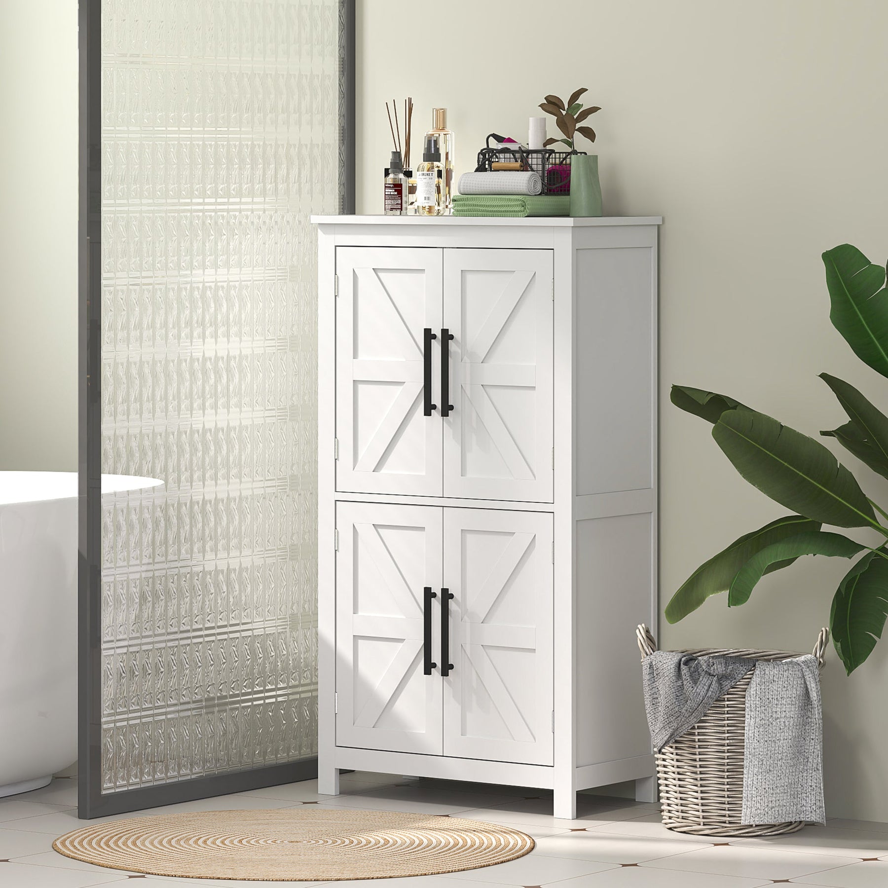 Bring both style and functionality to your home with this farmhouse-inspired bathroom storage cabinet. Featuring a four-shelf design concealed behind four stylish barn doors, this freestanding cabinet provides ample storage space for towels, toiletries, and other essentials, keeping your bathroom neat and organized. Two adjustable shelves with three height levels allow for customized storage, making it easy to store items of varying sizes. Designed with a rustic farmhouse aesthetic, the cabinet showcases charming barn-style doors complemented by sleek black metal bar handles, seamlessly blending with modern, vintage, or country décor. Built with durability in mind, this cabinet is crafted from sturdy MDF and includes protective foot pads to prevent floor scratches, as well as an anti-tipping design to enhance stability and safety. Whether placed in the bathroom, hallway, or laundry room, this versatile storage cabinet is a stylish and practical addition to any space. Measuring 23.6 inches long, 11.8 inches wide, and 43.3 inches high, with a total weight capacity of 66 lbs, this cabinet is built for long-lasting use. Assembly is required.