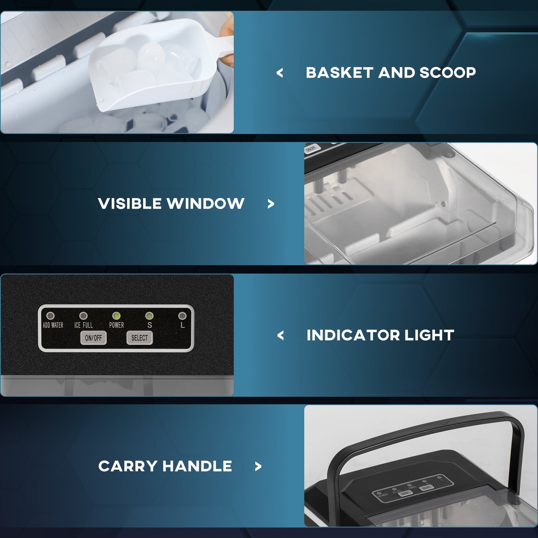 This compact and efficient ice cube maker is perfect for those in need of quick and easy ice production. With a 0.3-gallon (1.3 L) water tank, it can produce 9 bullet-shaped ice cubes in just 6 to 13 minutes, totaling up to 26lbs (12kg) of ice every 24 hours. The air cooling system ensures fast ice production, making it ideal for family gatherings or parties. The easy-to-use design includes indicators that prompt you when the ice basket is full or when the water level is low, with a top cover featuring a visible window for monitoring the ice-making process. Choose between two ice cube sizes to fit your needs, and keep the unit hygienic with the self-cleaning mode, which is activated by pressing the "ON/OFF" button for 5 seconds. Despite its powerful performance, the unit operates at a maximum noise level of only 43dB, making it a great choice for small spaces. Accessories included: ice basket and ice scoop.