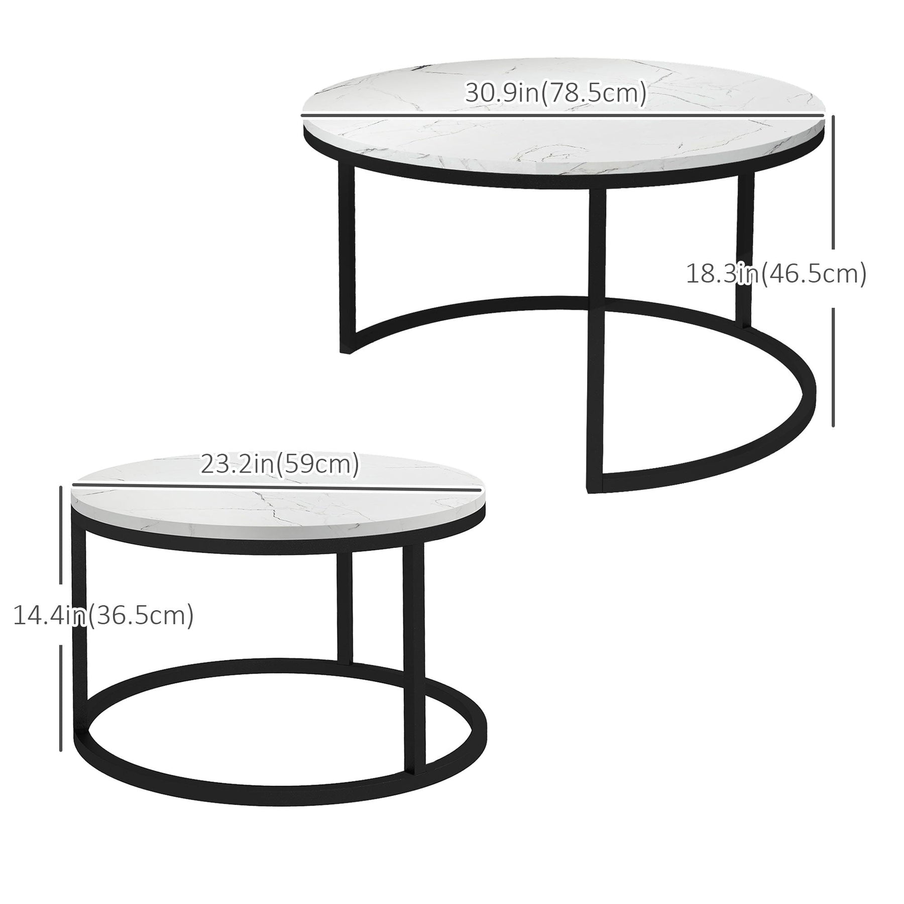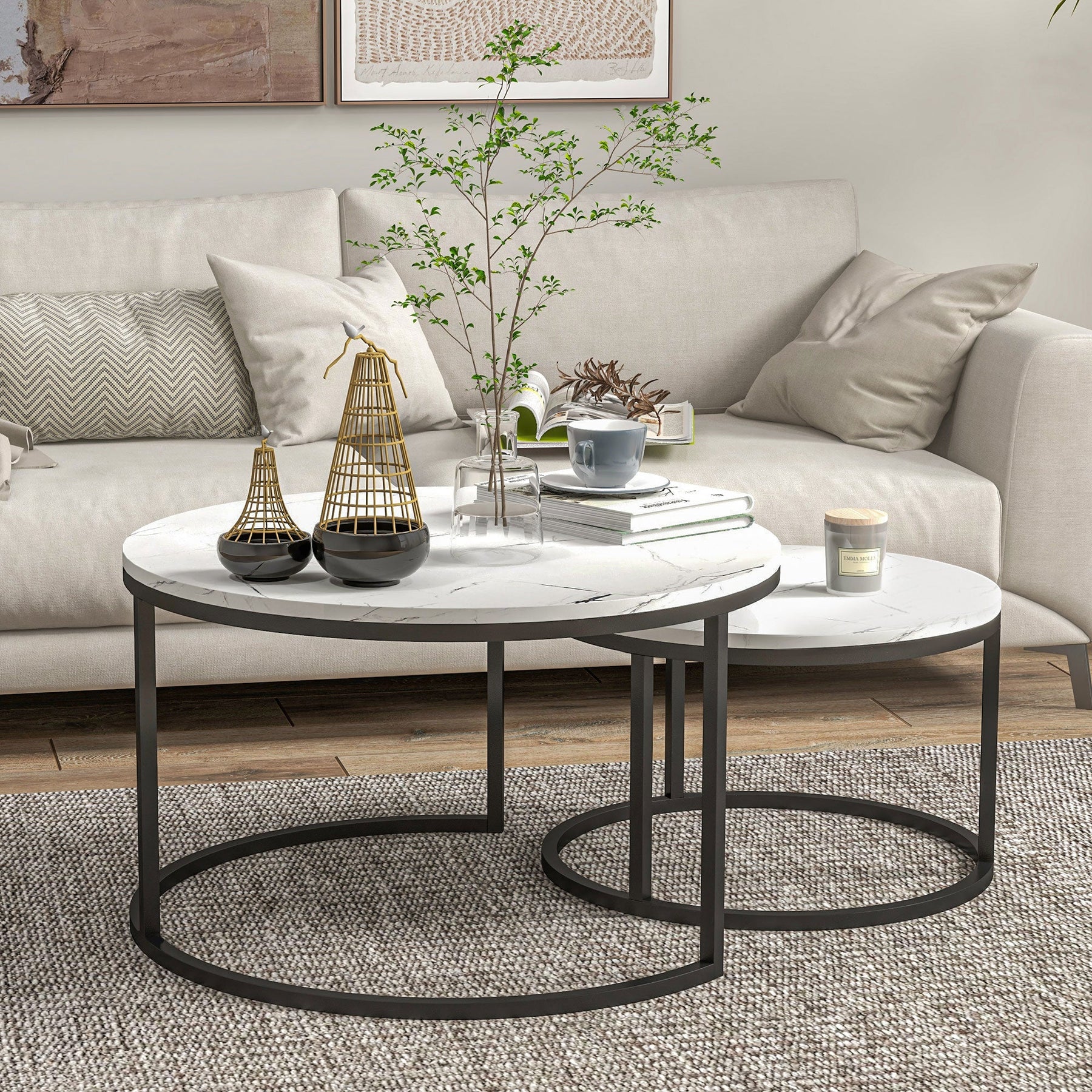 This round coffee table set blends modern elegance with practical functionality, featuring a stylish tabletop and sleek metal base. Ideal for any living room, dorm, office, or conference room, this set provides a versatile and chic solution to your space. The nesting design allows you to either separate the tables for independent use or stack them together to save space. These tables can serve as end tables, tea or coffee tables, nightstands, or even accent tables. Made from durable MDF and a steel frame, the tables provide a stable platform for your items while adding a touch of sophistication to any room. Safety features, including circular corners and foot pads, ensure the tables are both user-friendly and floor-protective, preventing scuffs or indentations.