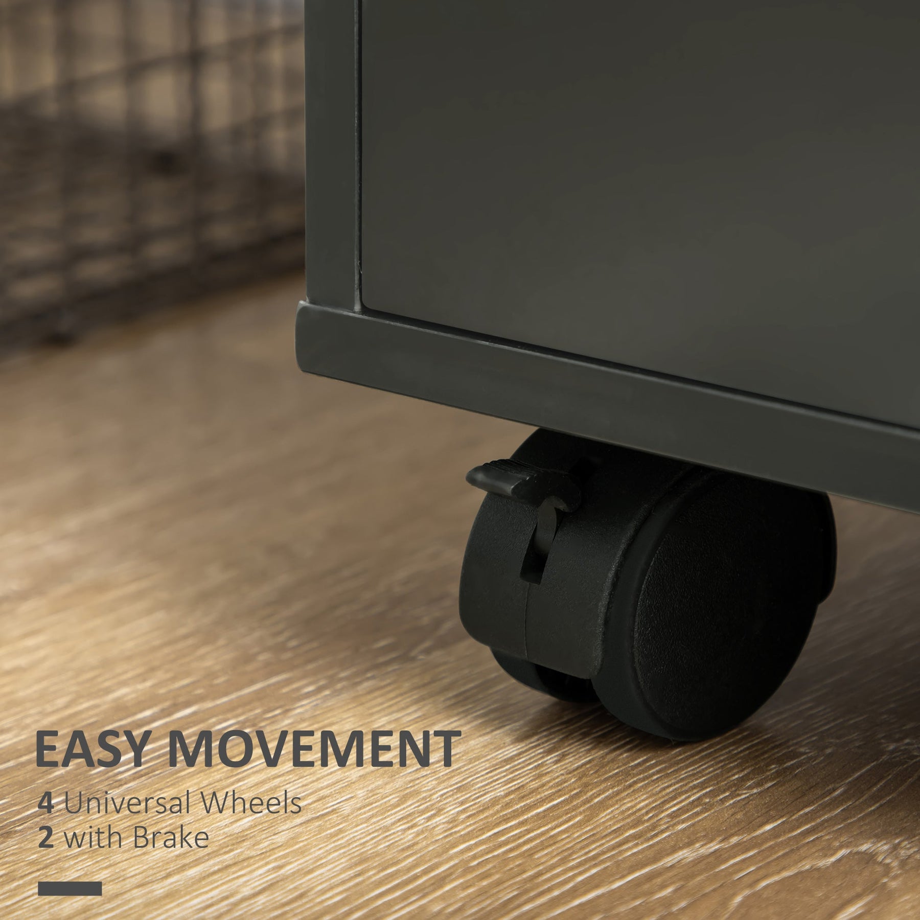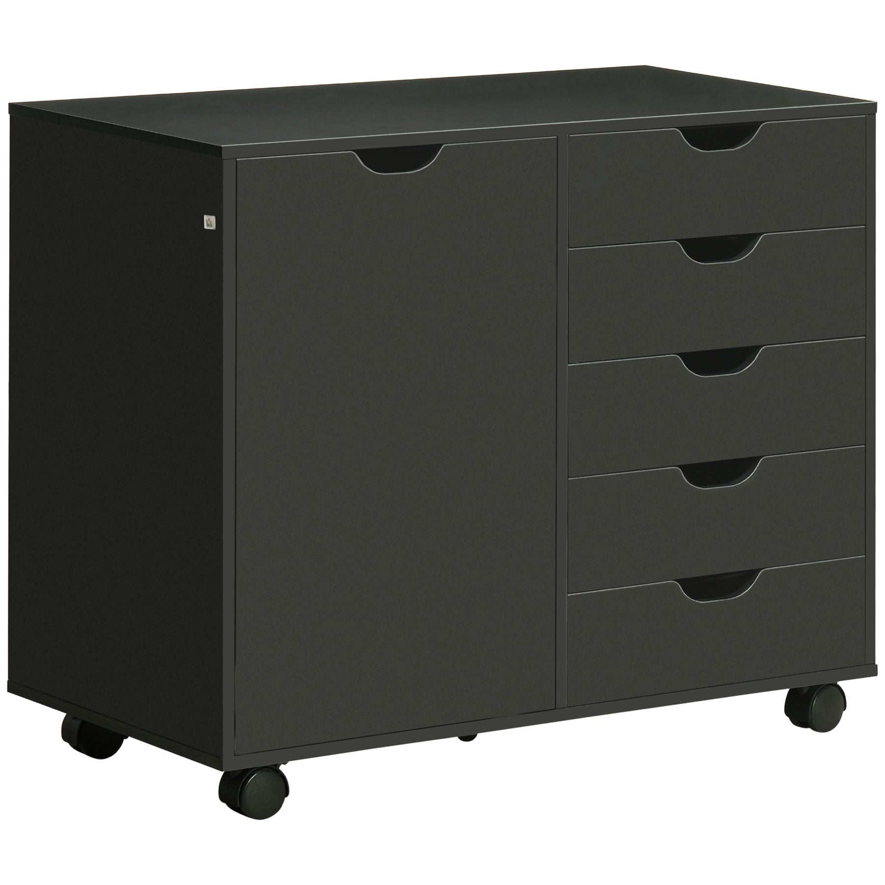 Maximize your workspace with this versatile chest of drawers, designed to keep your home office tidy and organized. Featuring five spacious drawers, this unit allows you to store bulky items out of sight and neatly organize smaller things in its various compartments. The roomy desktop can easily accommodate printers, scanners, and other office essentials, offering you extra surface space for efficient work. Inside, the adjustable shelving gives you the flexibility to tailor the storage to your needs. You can easily adjust the shelf height, and the adjustable door hinges ensure perfect alignment every time, making it easy to keep your space clutter-free. For added convenience, this filing cabinet comes with four 360° smooth-rolling casters, making it easy to move and position anywhere. The brakes on two of the casters add stability and security, keeping it in place when needed. Built with unwavering stability in mind, the particleboard structure ensures that this office cabinet can securely hold all your essentials. The integrated track system guarantees smooth operation for the drawers, making organization a breeze. With overall dimensions of 30.7"W x 15.7"D x 26.2"H, this storage unit has a weight capacity of 154 lbs, offering both practicality and durability for your home office.