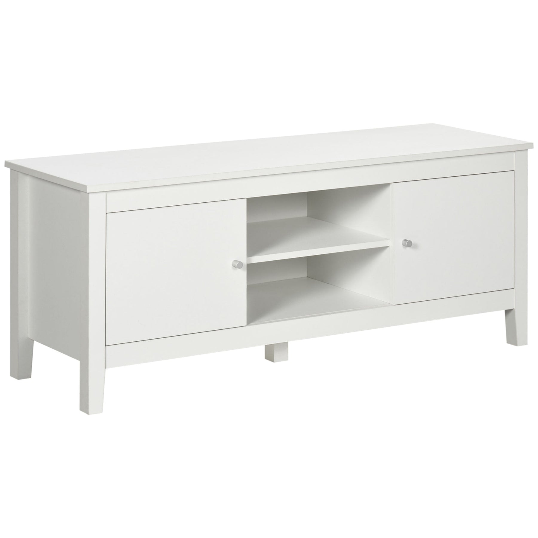 This minimalist TV cabinet is the perfect blend of style and functionality. Designed in pure white, it effortlessly complements various furniture styles and enhances any living room. The TV unit can comfortably accommodate TVs up to 55 inches, offering ample storage space for your entertainment needs. Equipped with two open shelves and two enclosed cupboards, this entertainment unit keeps your media devices, movies, and games neatly organized. To eliminate cable clutter, the TV stand includes two cable holes that ensure your cords stay hidden and your setup remains tidy. Constructed from durable particle board with a melamine coating, the surface is smooth and resistant to water damage, providing both style and practicality. The cushioned hinges on the cupboard doors allow for a soft, quiet close, keeping your fingers safe while adding an extra touch of convenience.