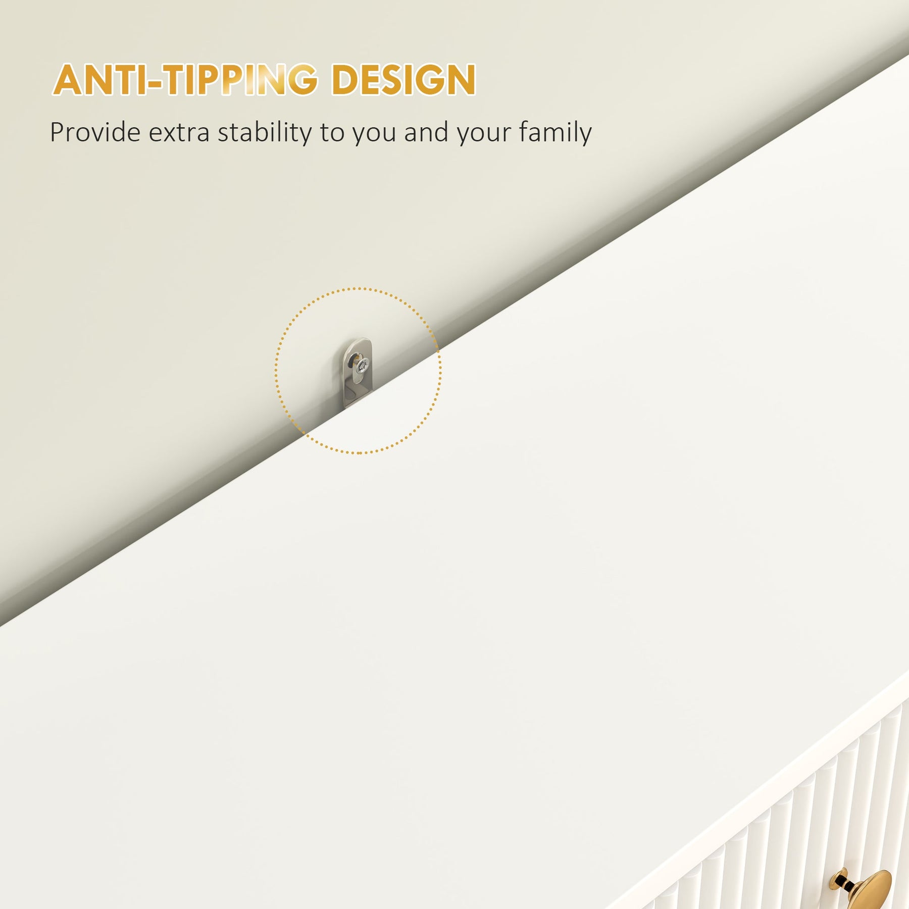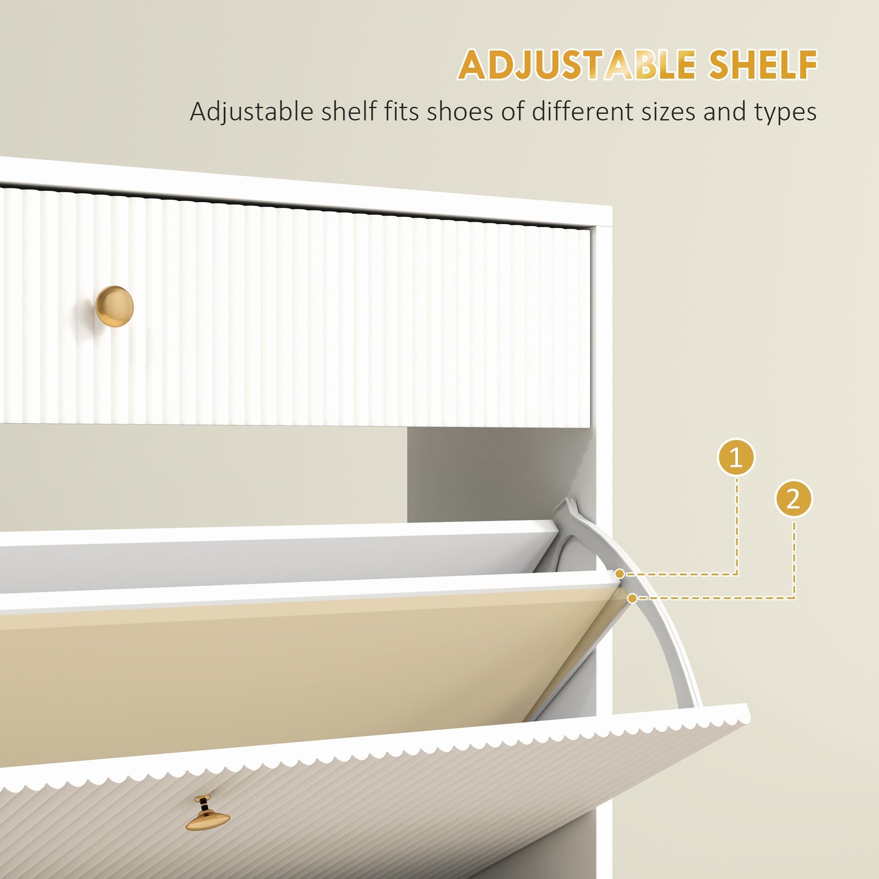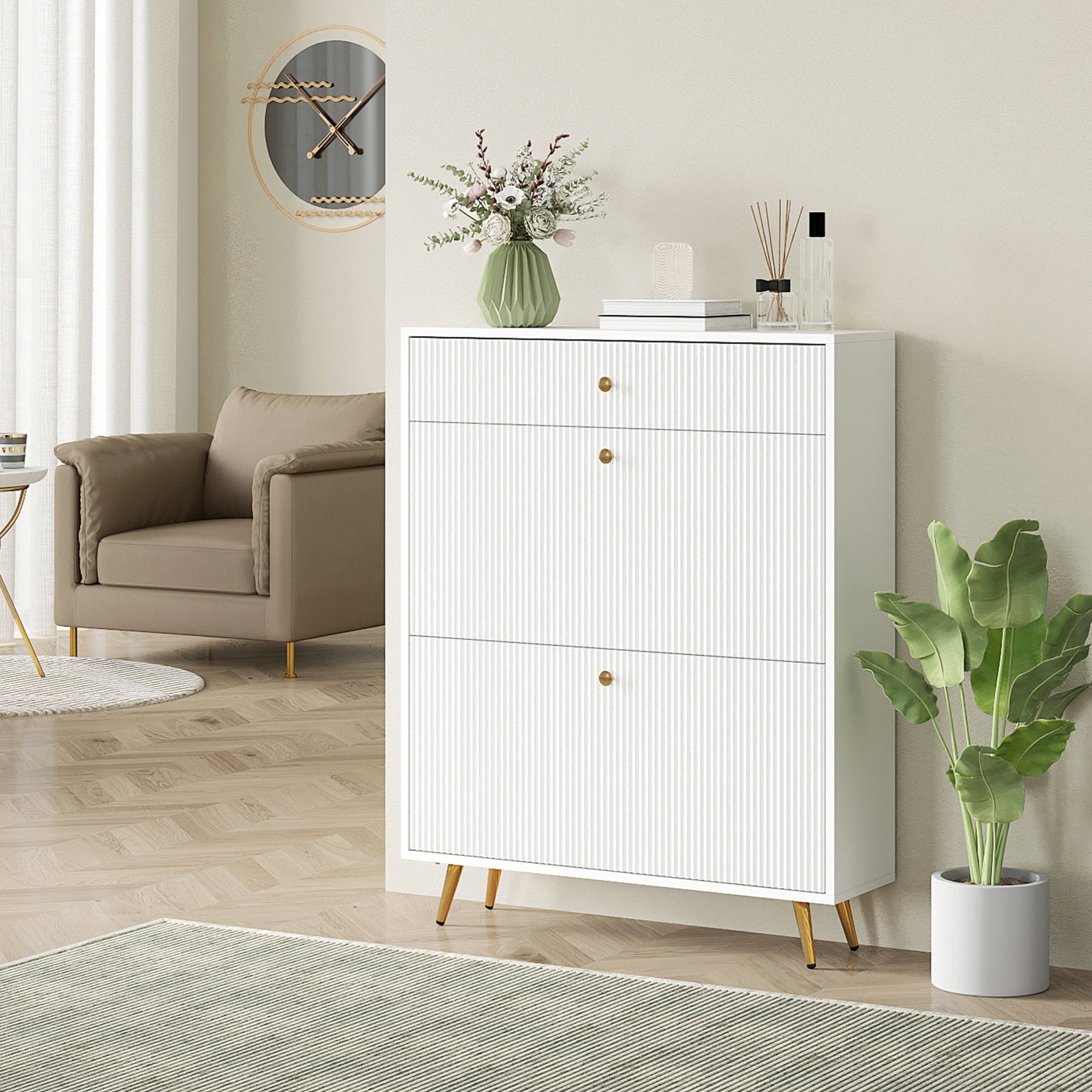 Introduce modern elegance to your home with this slim and stylish shoe cabinet, featuring a sleek white finish, wave-like fluted panels, and gold handles. Ideal for entryways or living rooms, this cabinet maximizes your space with two flip drawers that can hold up to 12 pairs of shoes, along with a small drawer for everyday essentials like keys and wallets. The flat top offers additional space to display your favorite decor pieces. The adjustable and removable shelves allow for flexible storage, fitting various shoe sizes and types. Designed with safety in mind, this cabinet includes an anti-tipping feature to ensure stability and peace of mind.