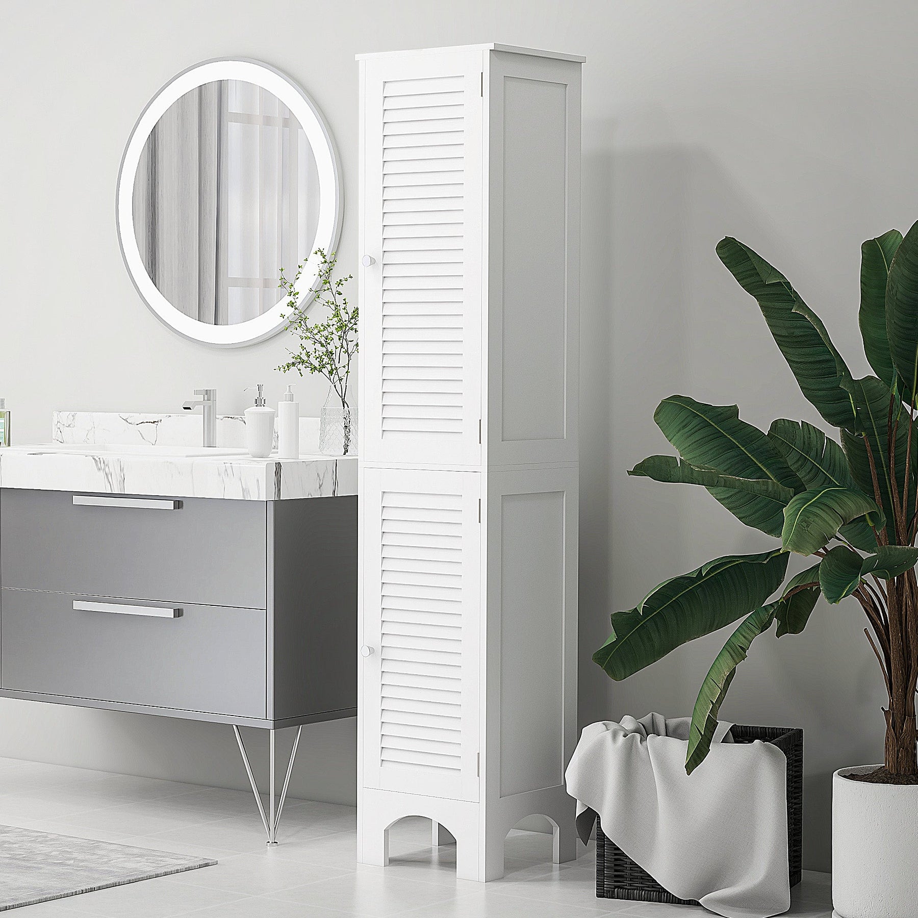 Maximize your storage in small spaces with this elegant and functional tall storage cabinet. It features two cabinets with shelves, offering ample space to organize bathroom essentials or other household items. The slim design makes it a great fit for corners or tight areas, ensuring you can utilize every inch of your home without sacrificing storage capacity. The painted MDF frame with louver-style doors adds a decorative touch to any room, making this cabinet a stylish addition to your space. Equipped with anti-slip foot pads and an anti-tipping design, it provides stability and safety, while the elevated base helps reduce moisture damage.