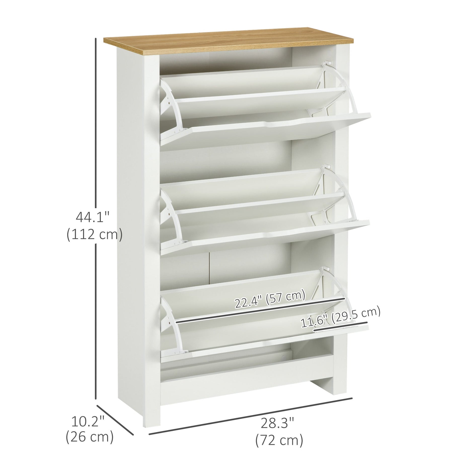 Maximize your space while keeping your shoes organized with this sleek and functional shoe storage cabinet. Featuring three pull-out drawers, each with a 2-level adjustable shelf, this cabinet can hold up to 18 pairs of standard-sized shoes. The flip doors with groove handles allow for easy access, while the compact design makes it perfect for narrow hallways and entryways. The flat tabletop offers additional space to keep keys, mail, or other essentials, all with a stylish oak-tone finish for added beauty. Constructed from melamine-coated particle board, this cabinet is durable and easy to maintain, with protective feet to prevent floor damage. An anti-tipping design ensures extra safety, making it a perfect choice for homes with children or pets.