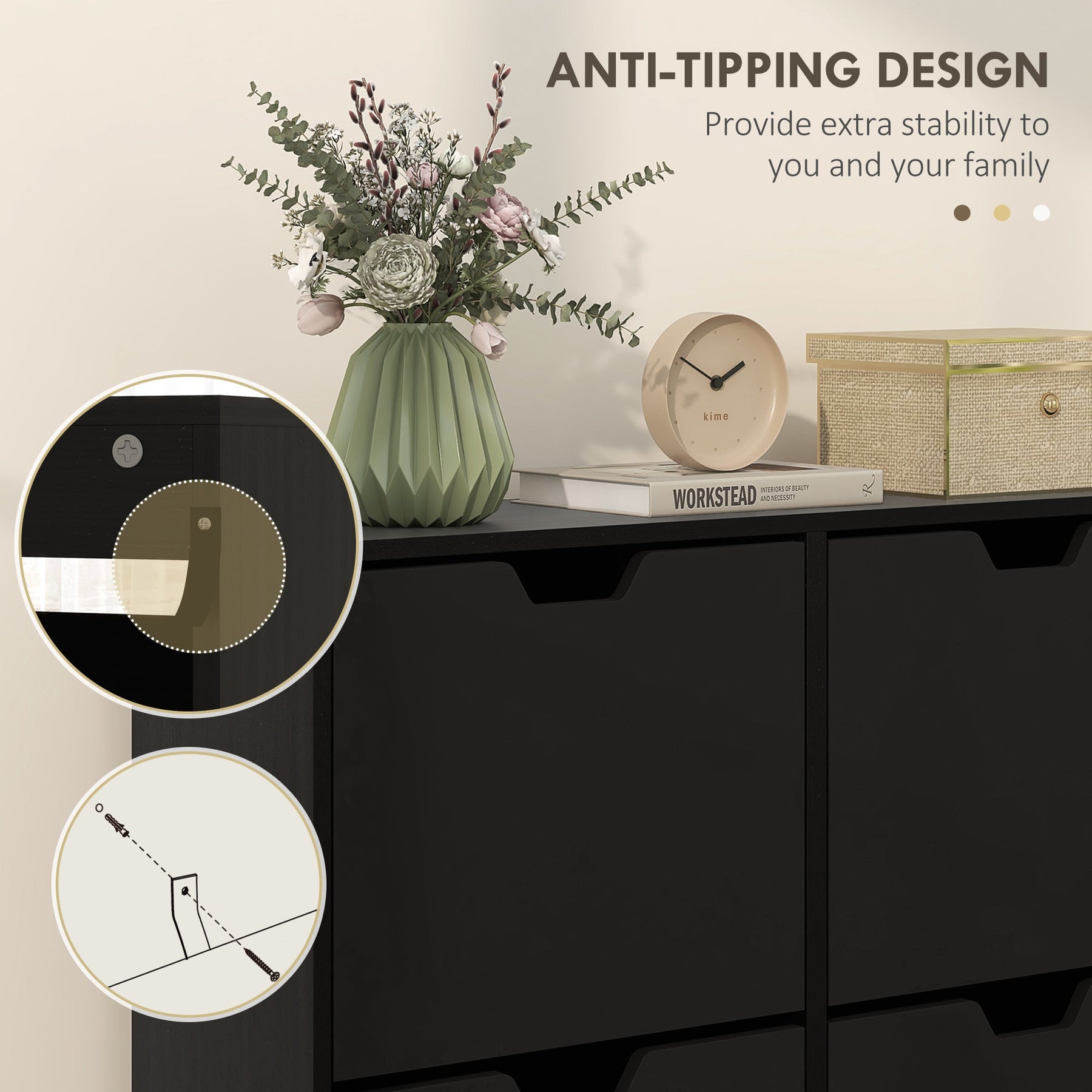 Safety Features: Includes anti-tipping straps for enhanced stability, especially in homes with children or pets.