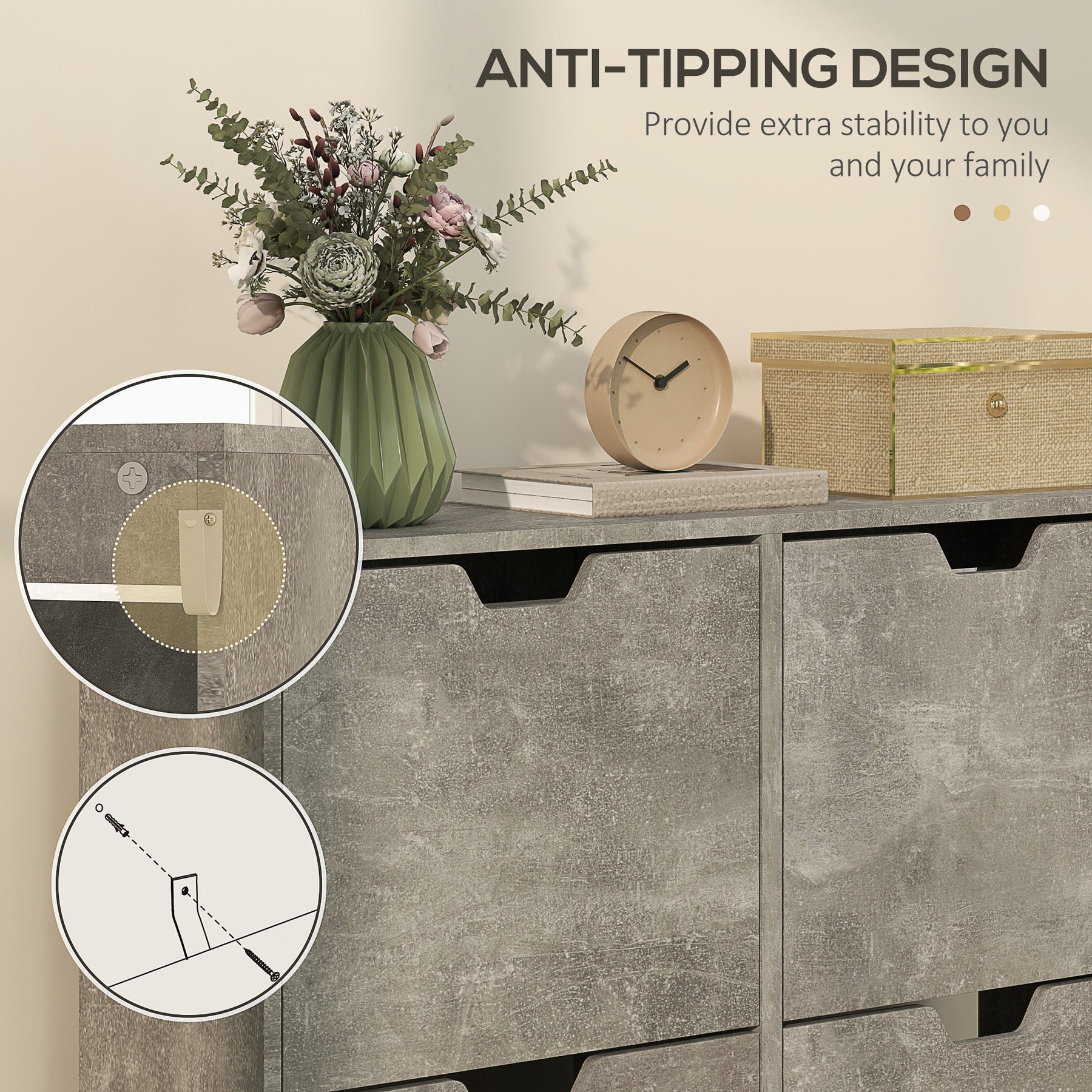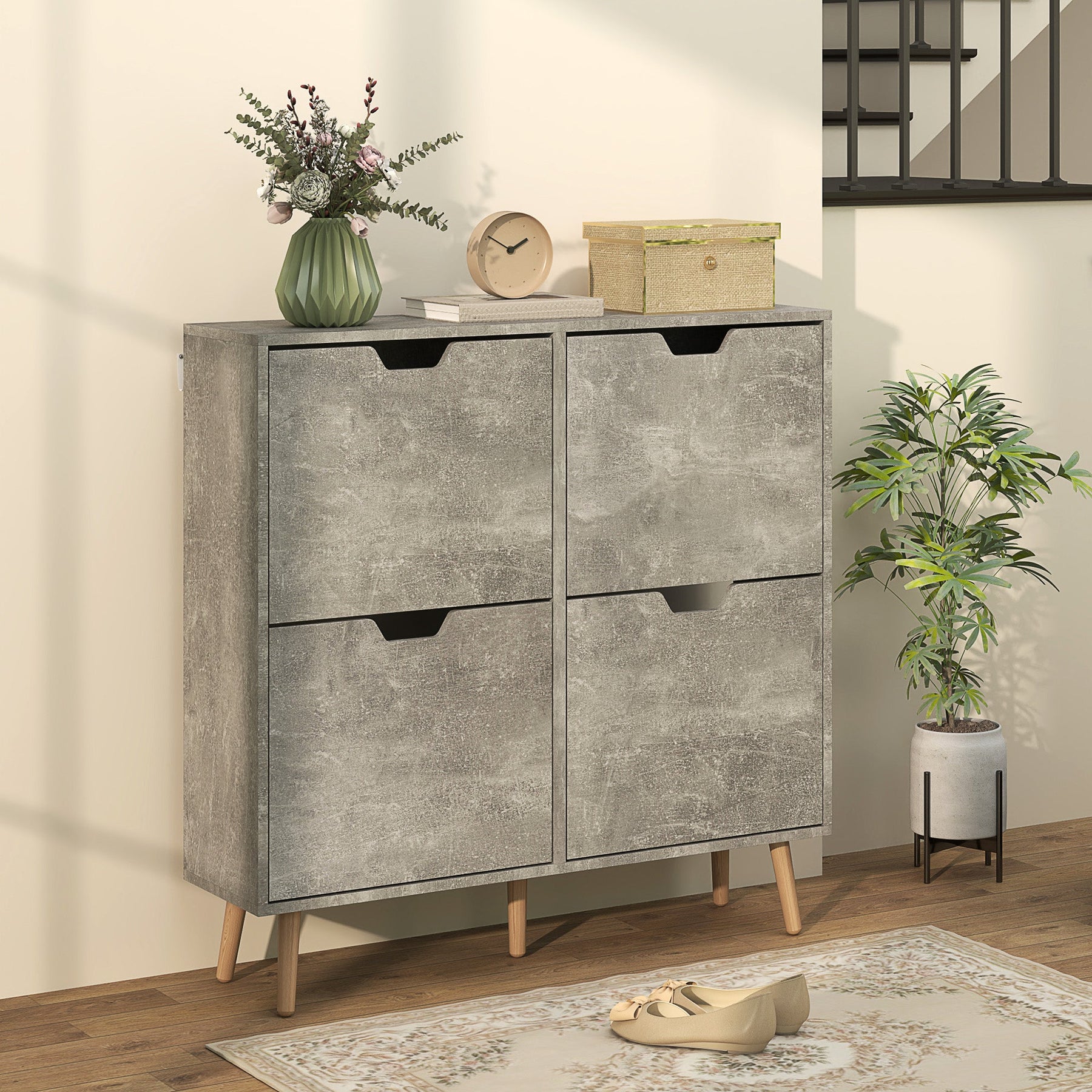 Keep your entryway neat and stylish with this tall and slim shoe storage cabinet. Designed for compact spaces, it features four flip drawers with adjustable shelves to accommodate up to 16 pairs of shoes, including various sizes and styles. The elegant and modern design seamlessly blends into any home décor, adding a touch of sophistication. Crafted from sturdy particleboard with solid wood legs, this shoe organizer ensures durability and stability for everyday use. For added safety, anti-tipping straps secure the unit to the wall, making it a safe choice for homes with children or pets.