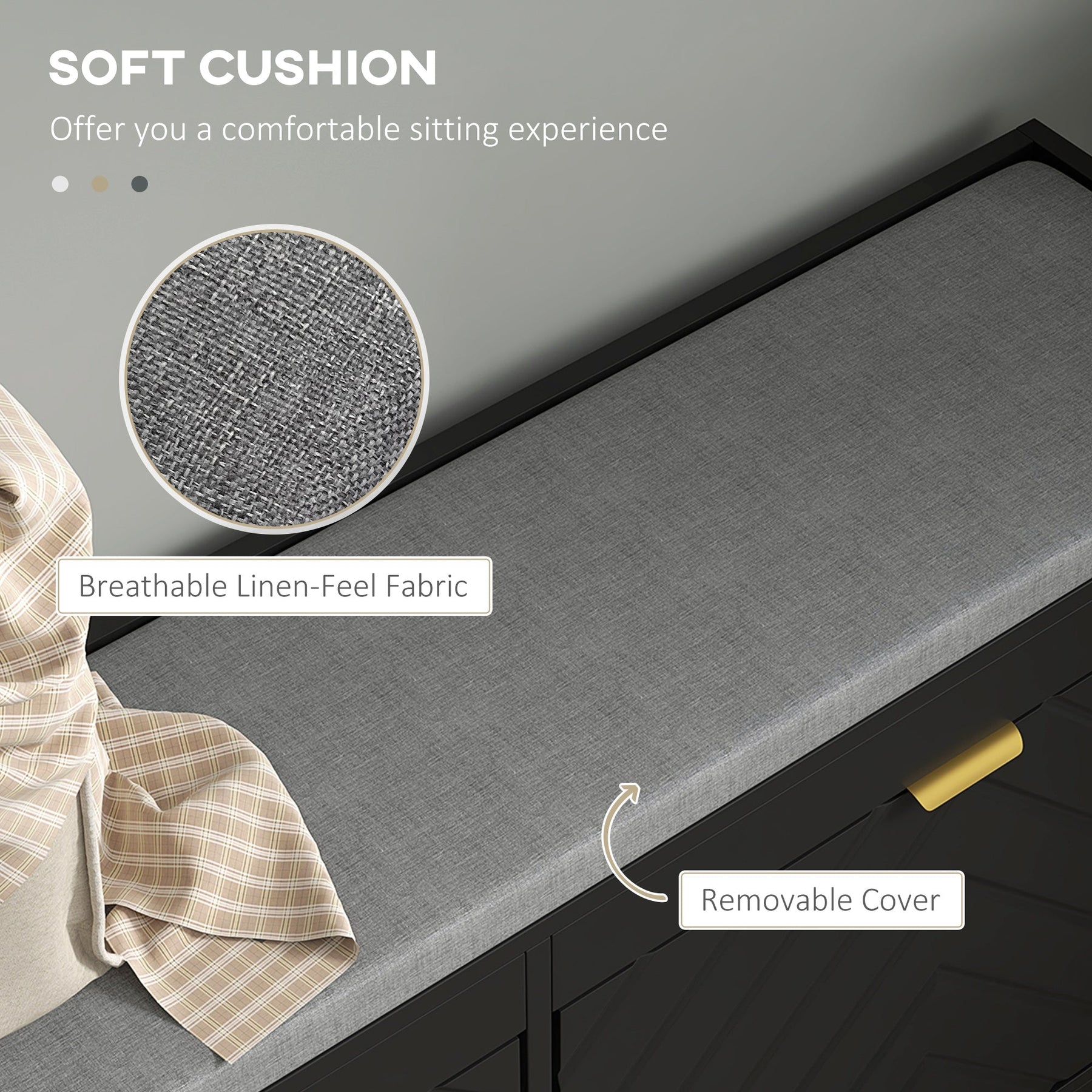 Comfort Seat: Thick padded cushion wrapped in breathable linen-feel fabric for a comfortable sitting experience.