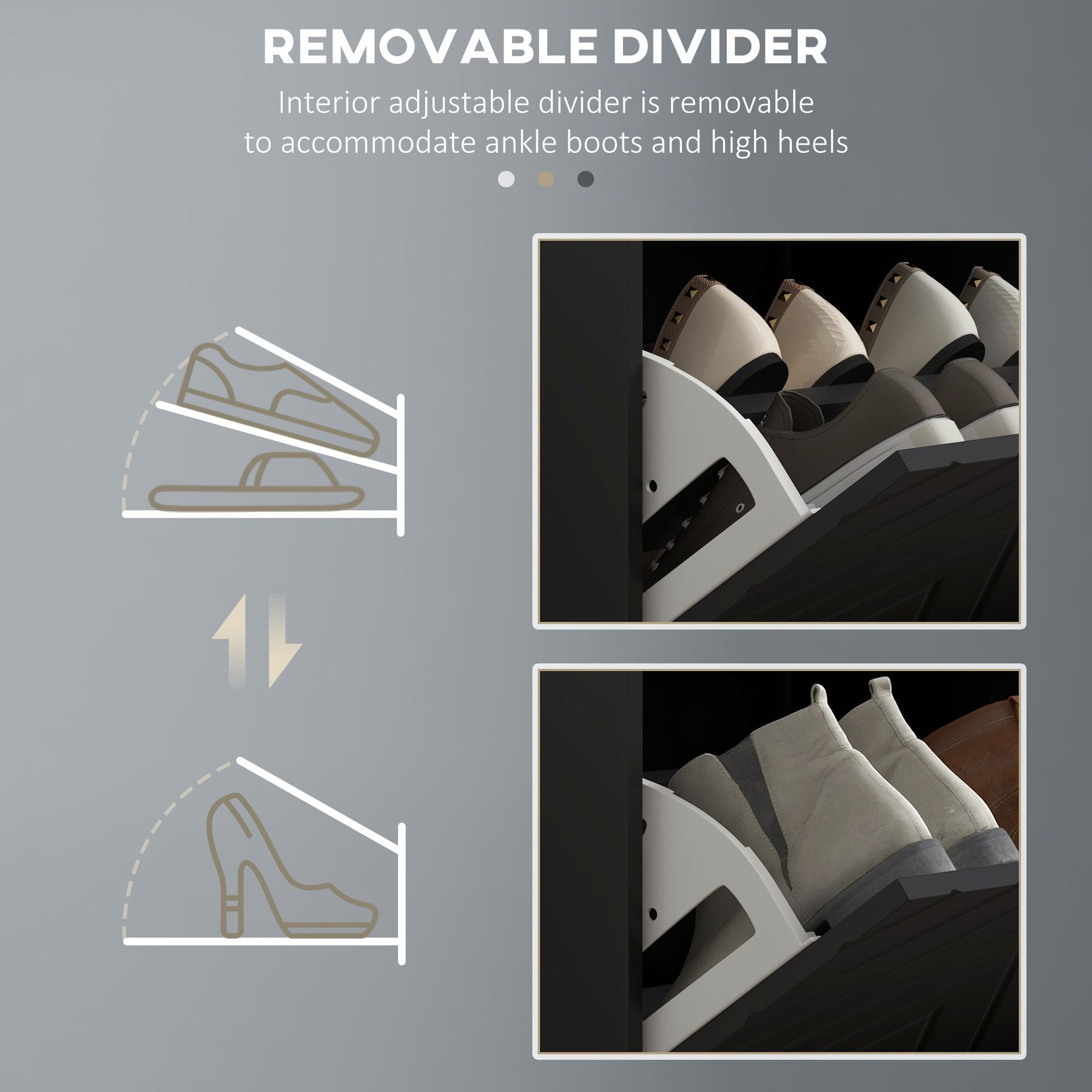 Farewell to Shoe Piles: Effortlessly access two flip drawers with comfortable handles to organize up to 8 pairs of shoes. Adjustable/removable internal dividers for ankle boots and high heels. Four ventilation holes prevent odor build-up.
