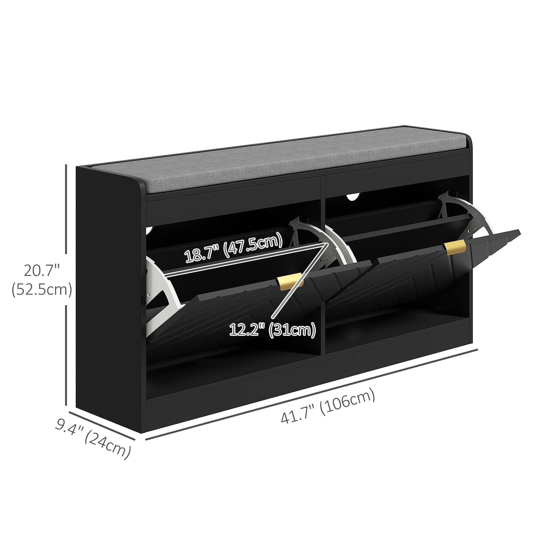 Dimensions & Weight Capacity: Overall dimensions: 41.7" W x 9.4" D x 20.7" H (106 x 24 x 52.5 cm). Weight capacity: 462 lbs (210 kg) overall, 440 lbs (200 kg) for the bench seat, 11 lbs (5 kg) for each drawer. Max shoe size: CA Men Size 10.