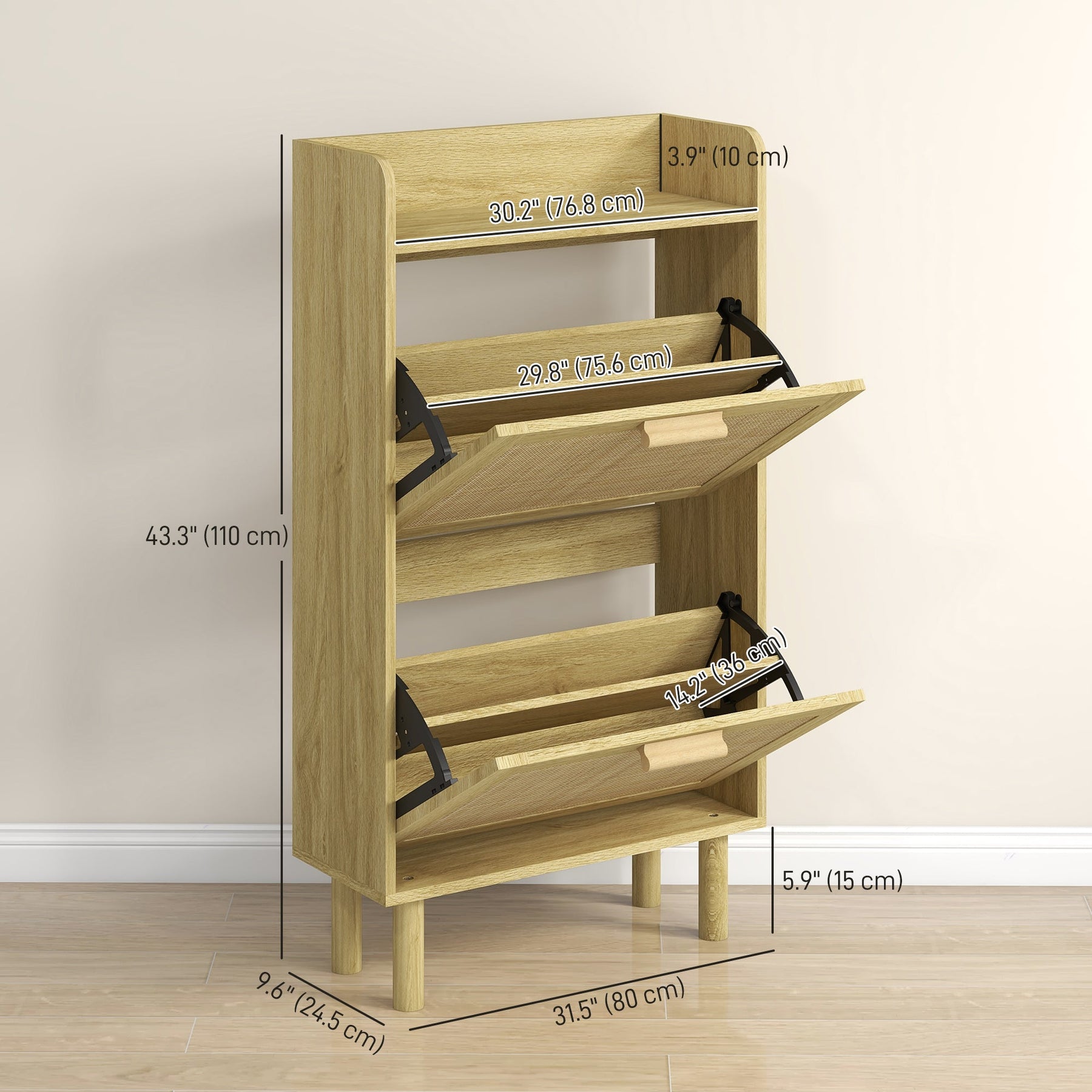 This stylish and practical shoe cabinet is designed to maximize storage in narrow hallways or entryways while adding a touch of boho charm to your home. Featuring two flip drawers with wood handles for easy access, it offers ample space for organizing shoes and other essentials. Each drawer contains a 3-level adjustable shelf, which allows you to customize the storage space to accommodate up to 12 pairs of shoes (Max Shoe Size: CA Men Size 9.5). The flat tabletop, with edge protection, provides additional space for displaying knick-knacks, photo albums, or placing your keys. The rattan doors lend a boho flair to the design, making it a perfect fit for various home styles. Built with a sturdy particle board frame and solid rubber wood legs, this shoe cabinet ensures stability and durability. It also features an anti-tipping design for added safety in homes with children or pets.