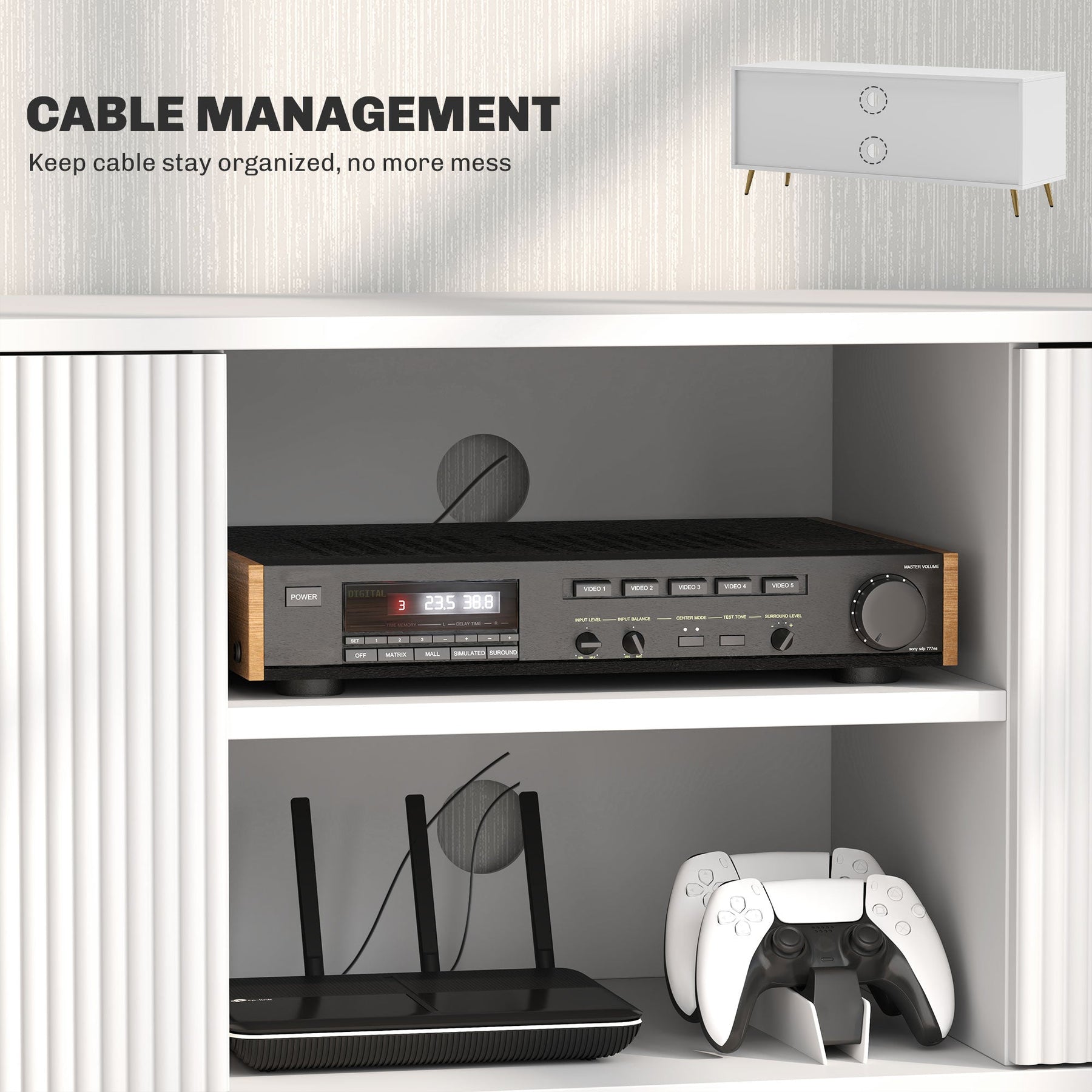 This modern TV unit brings both charm and practicality to your living room with its blend of beadboard cabinet doors and chic handles. Designed for TVs up to 55 inches, this media console features ample storage space, including two open compartments and two 2-tier cabinets with doors for organizing your devices, accessories, and more. Efficient cable management is made easy with two cable holes on the back of the unit, helping you keep wires organized and your space tidy. Constructed from durable melamine-faced particle board and treated MDF, this entertainment unit is built to last and is stable for everyday use. The foot pads provide additional stability while protecting your floors from damage.