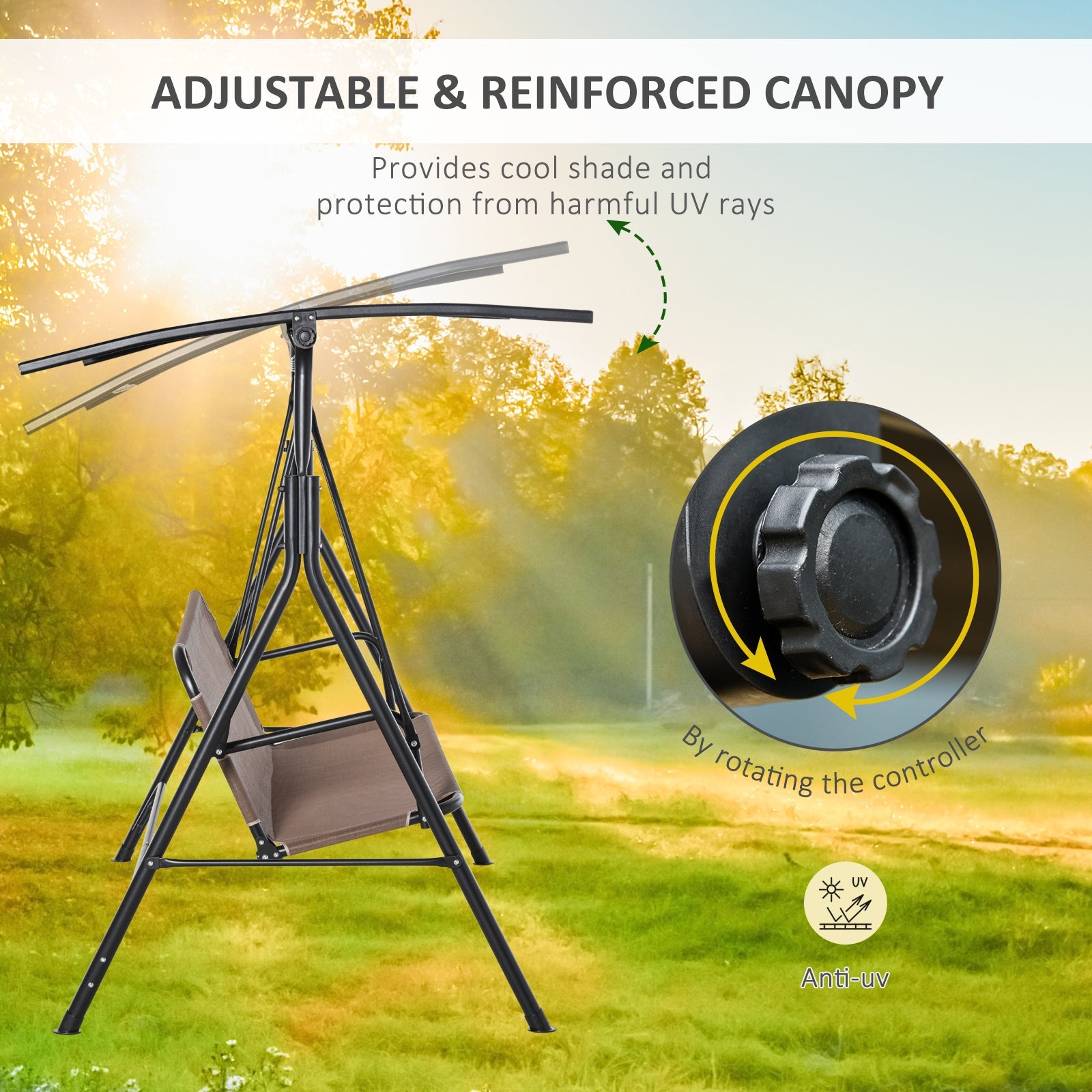 Relax in style and comfort with this outdoor porch swing, designed to seat two people. Perfect for warm summer days, this swing provides the ideal space to sit back, enjoy the breeze, and spend quality time with a friend. The adjustable canopy offers shade from the sun, and with the rotary knob, you can easily adjust the roof’s angle to eliminate glare for a more pleasant experience. Covered in breathable mesh fabric, this swing dries quickly, allowing you to continue swinging even after a light rain. The powder-coated steel frame provides a sturdy structure, and the extra stable "A" frame design ensures stability. Anti-slip foot pads protect your surfaces from scratches, making this swing a great addition to any outdoor setting.
