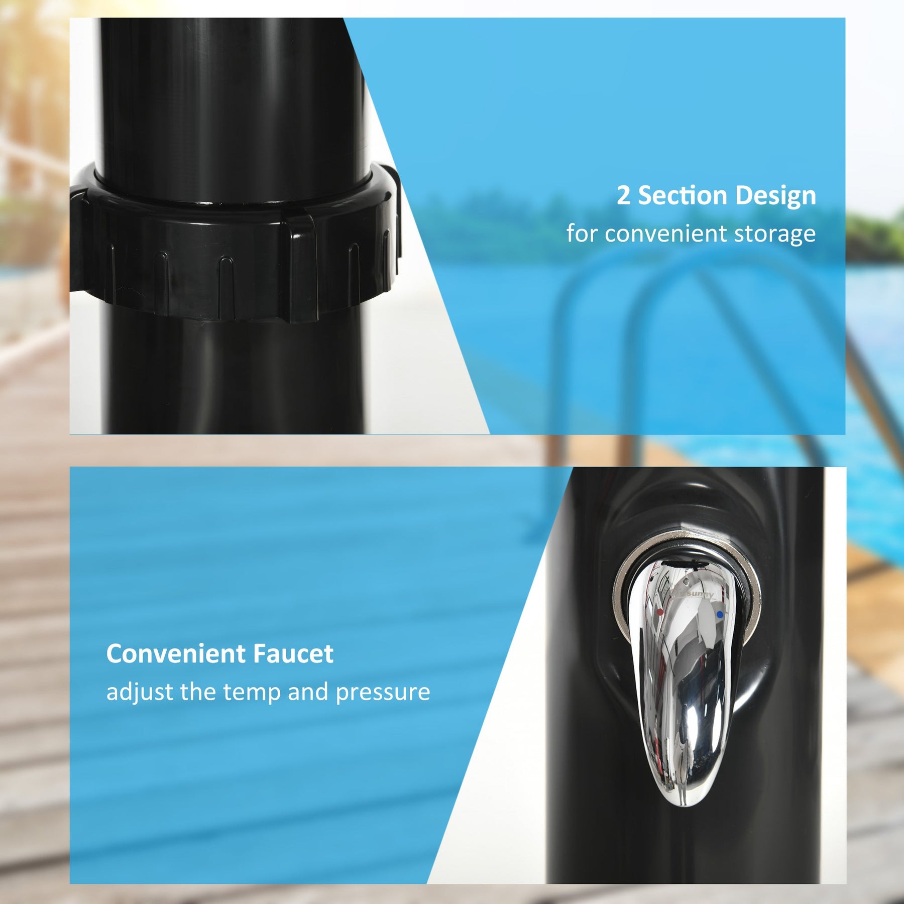 Outdoor Solar-Powered Shower: Uses solar energy to heat the water, with a 5.3-gallon tank that can raise the temperature up to 60°C, ensuring warm showers.