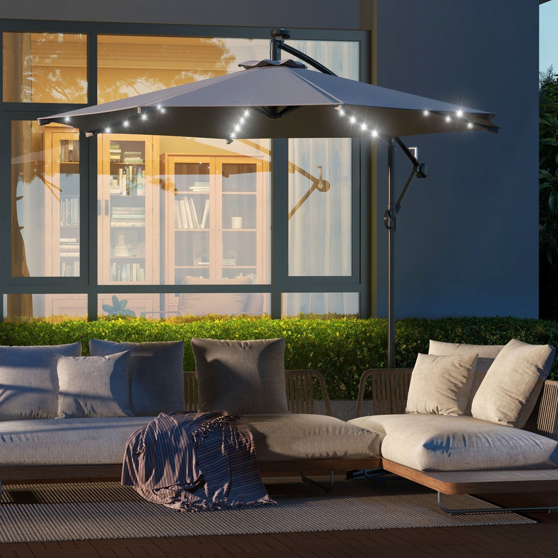 Enhance your outdoor space with this stylish and practical solar-powered offset cantilever umbrella. Featuring energy-efficient solar panels, this umbrella is equipped with built-in LED lamp beads in each rib, allowing you to illuminate your night with soft, ambient lighting. The convenient switch on the rib makes it easy to turn the lights on and off. Its dark blue square design provides ample coverage, making it perfect for large patio furniture that doesn’t have a central hole for a standard umbrella. Whether you're covering sectionals, pool lounge chairs, or a patio dining set, this umbrella offers comfortable shade even in challenging situations. Built with a sturdy steel pole and eight durable ribs, this umbrella is designed for long-term use. Vents at the top allow wind to flow through, improving stability. Perfect for gardens, backyards, and poolside areas, this anti-UV outdoor umbrella ensures you stay cool and protected under the sun.