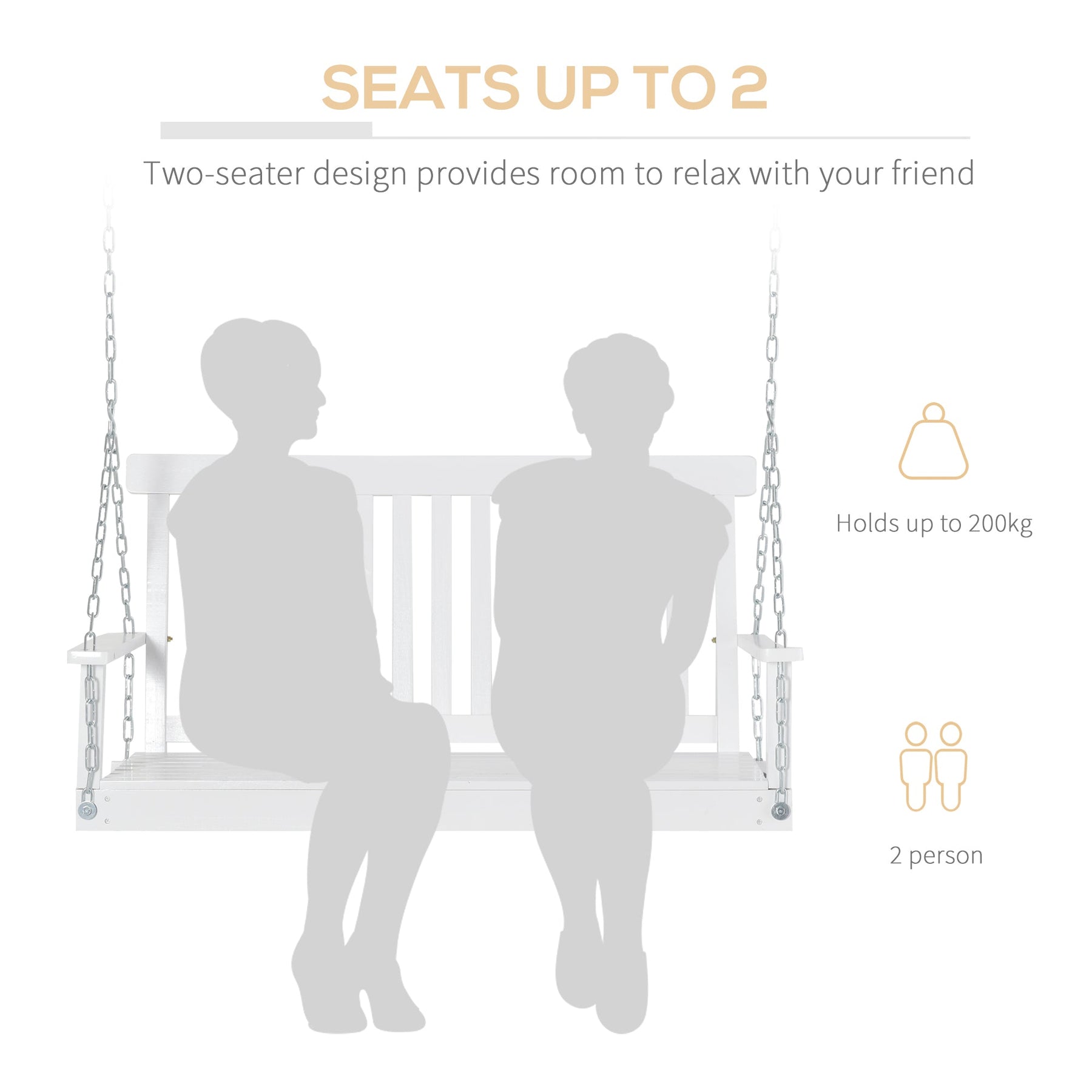 Relax in timeless comfort with this wooden hanging swing chair, designed to seat up to two people with a weight capacity of 440 lbs. Perfect for enjoying warm afternoons or cool evenings on your porch, patio, garden, or sunroom, this swing chair adds a cozy, classic touch to any outdoor space. Crafted from natural wood and coated with a weather-resistant varnish, it is built to withstand the elements while maintaining its charming appearance. The sturdy galvanized steel hanging chains ensure safe and secure suspension from a higher platform, giving you peace of mind as you sway. Its slatted seat and backrest offer excellent comfort, support, and breathability, making it a stylish and functional addition to your outdoor furniture collection.