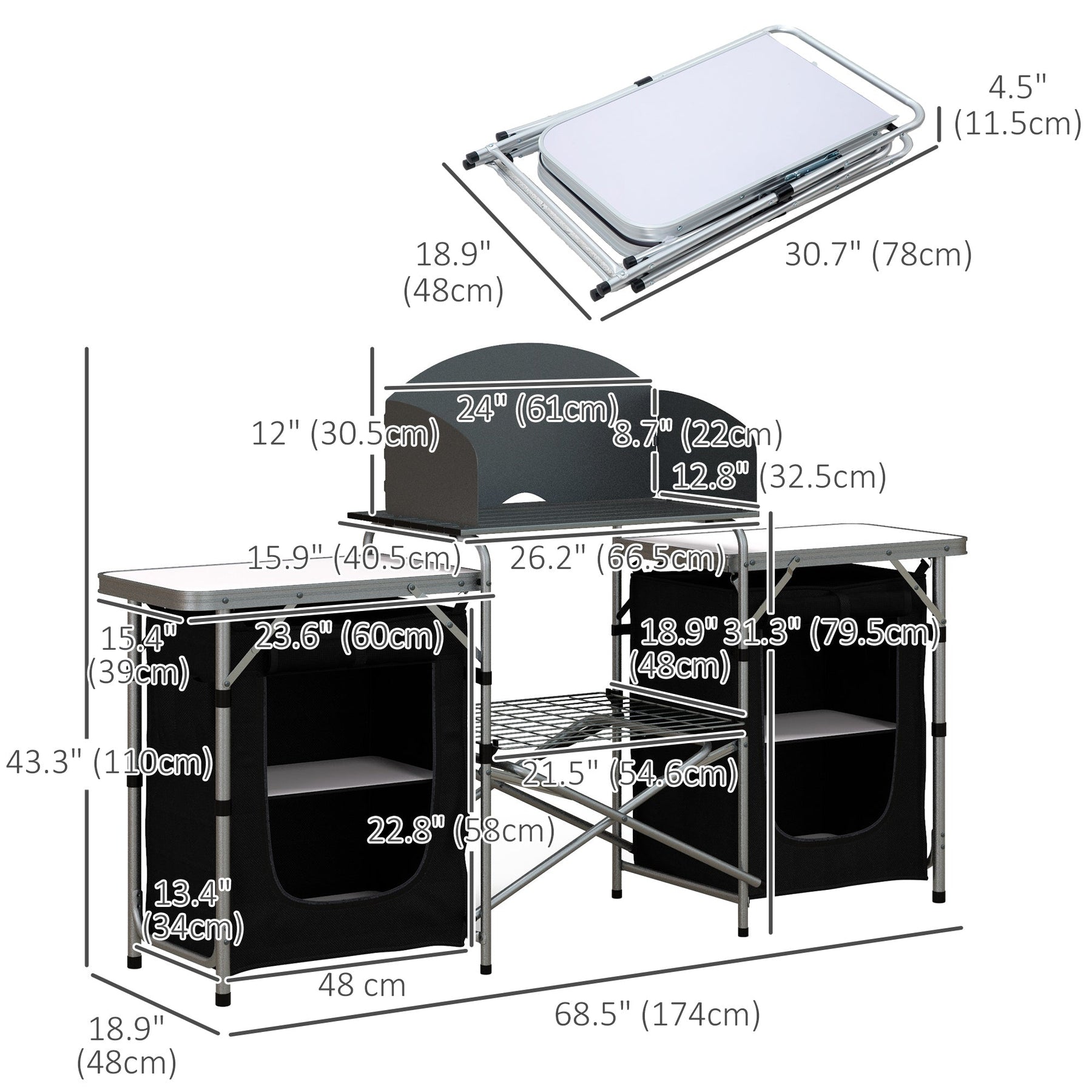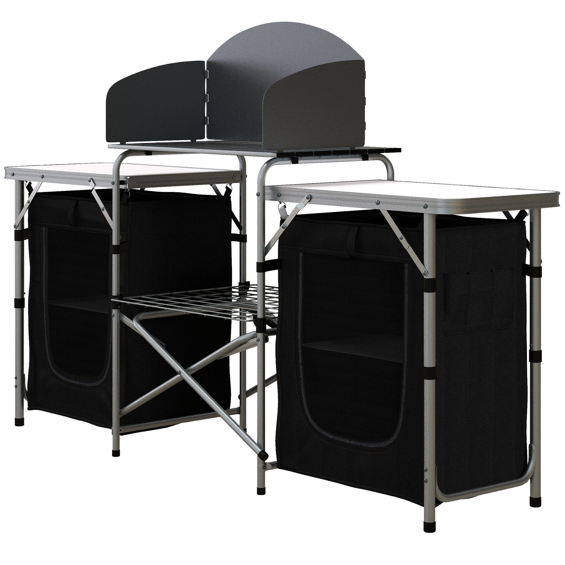 Make outdoor cooking and storage hassle-free with this mobile camping kitchen. Featuring three aluminum cooking tables, including a windscreen for safe cooking, this portable table is essential for enjoying a full meal wherever your adventures take you. Whether you're camping with a tent, caravan, bus, or motorhome, this camp kitchen provides ample storage and workspace. It’s designed to be detachable and foldable, making it easy to store and transport in the included carrying bag. With three tabletops, two cupboards, and a mesh shelf, this camp kitchen offers plenty of room to store food, cans, condiments, and more. Built with heavy-duty Oxford fabric and solid aluminum, this kitchen unit is both durable and sturdy, capable of supporting all your outdoor cooking essentials.
