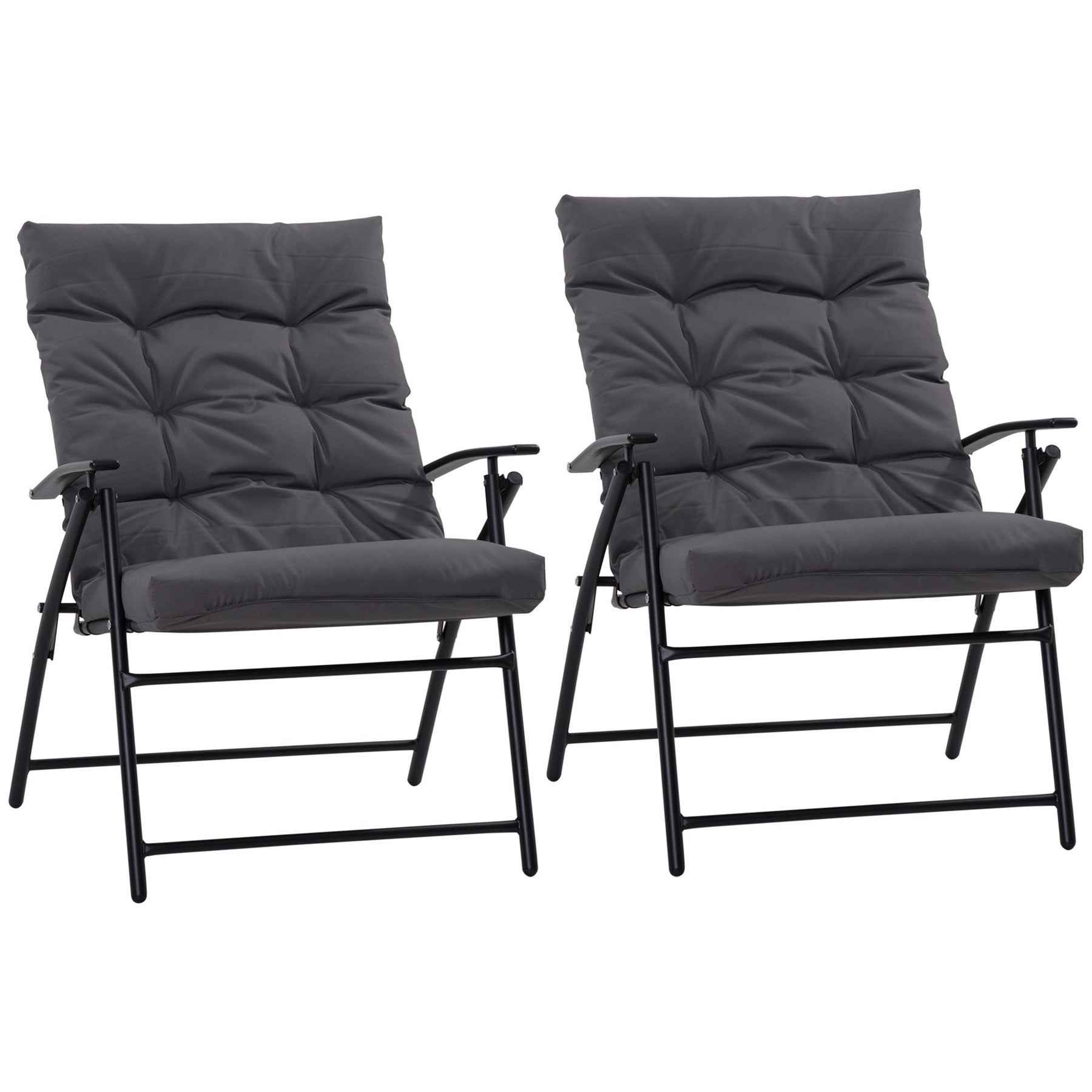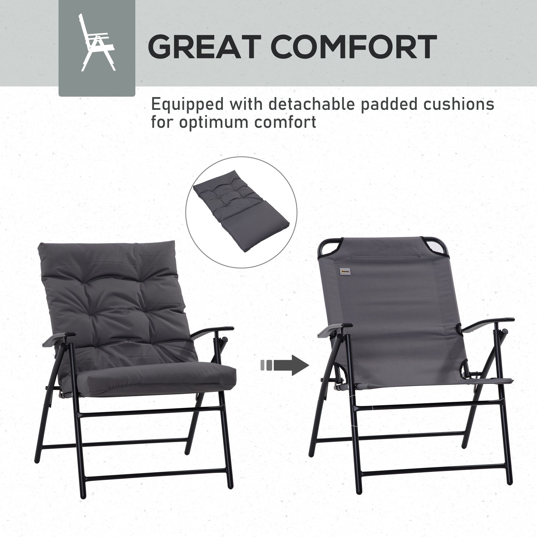 Enhance your outdoor experience with this set of two foldable chairs, perfect for camping trips, picnics, backyard gatherings, or extra seating for guests at home. Designed for convenience, these chairs feature a lightweight and foldable structure, making them easy to transport in your car or store when not in use. The adjustable backrest offers two reclining levels, allowing you to find the most comfortable position for relaxation. For added comfort, each chair is equipped with a detachable padded cushion, ensuring a cozy seating experience. The cushions are covered with durable Oxford fabric, which provides long-lasting use and resistance to wear and tear. Whether you're enjoying a quiet moment in your garden or taking them on an outdoor adventure, these chairs combine comfort, versatility, and practicality in one stylish set.