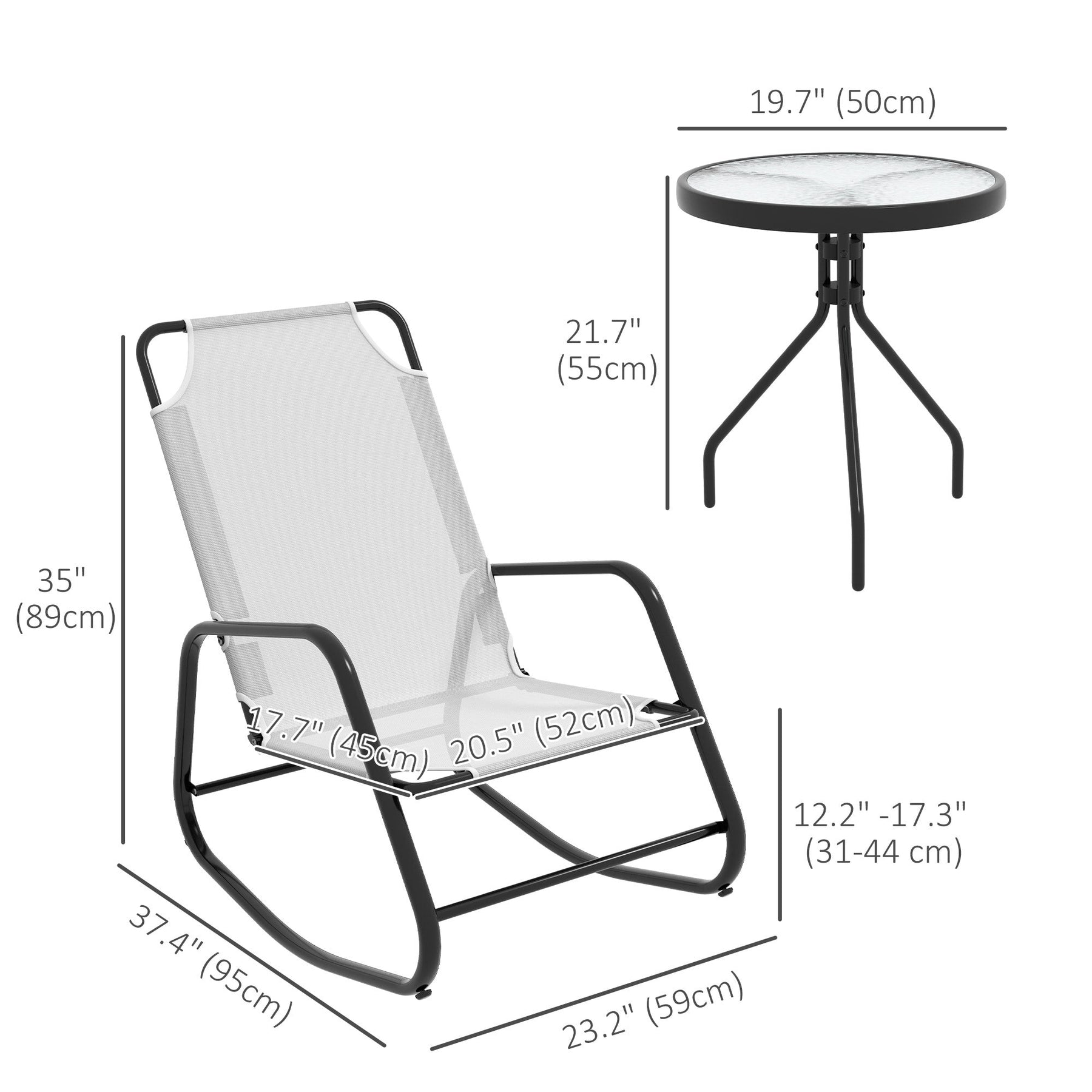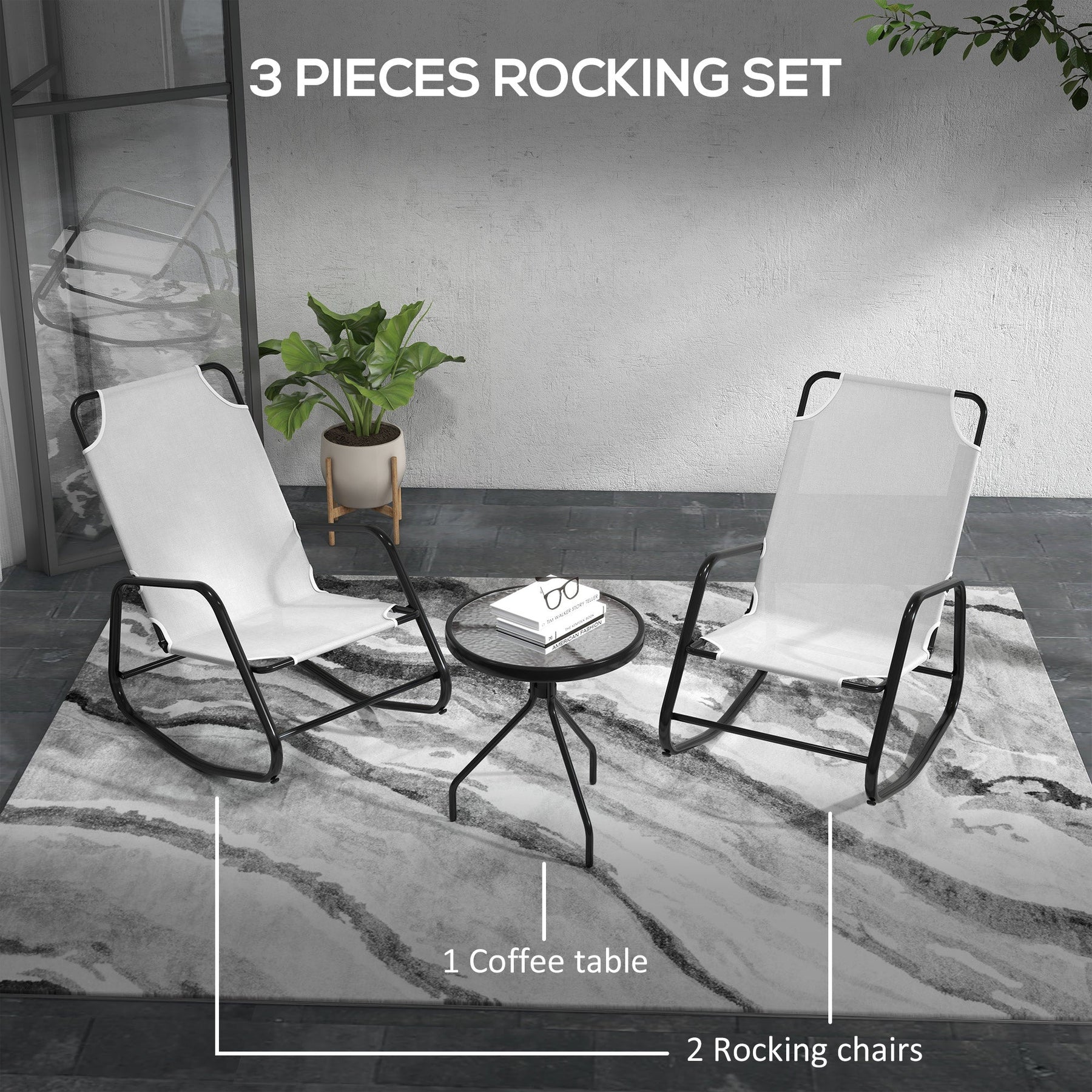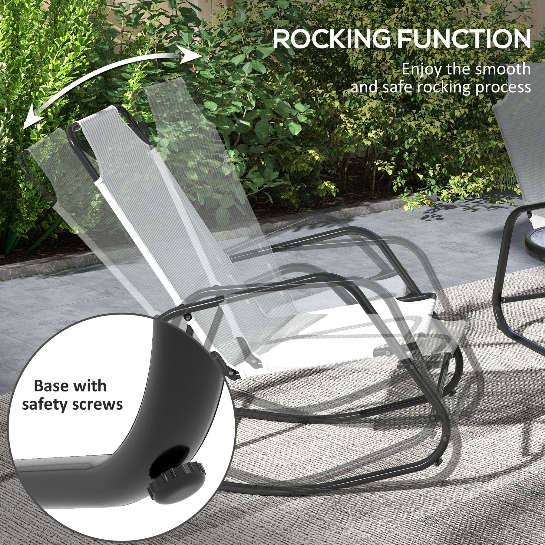 Outsunny Patio Rocking Chairs Set of 2, 3 Pieces Patio Bistro Set with Metal Frmae, Breathable Mesh Fabric Seat for Garden, Deck, White