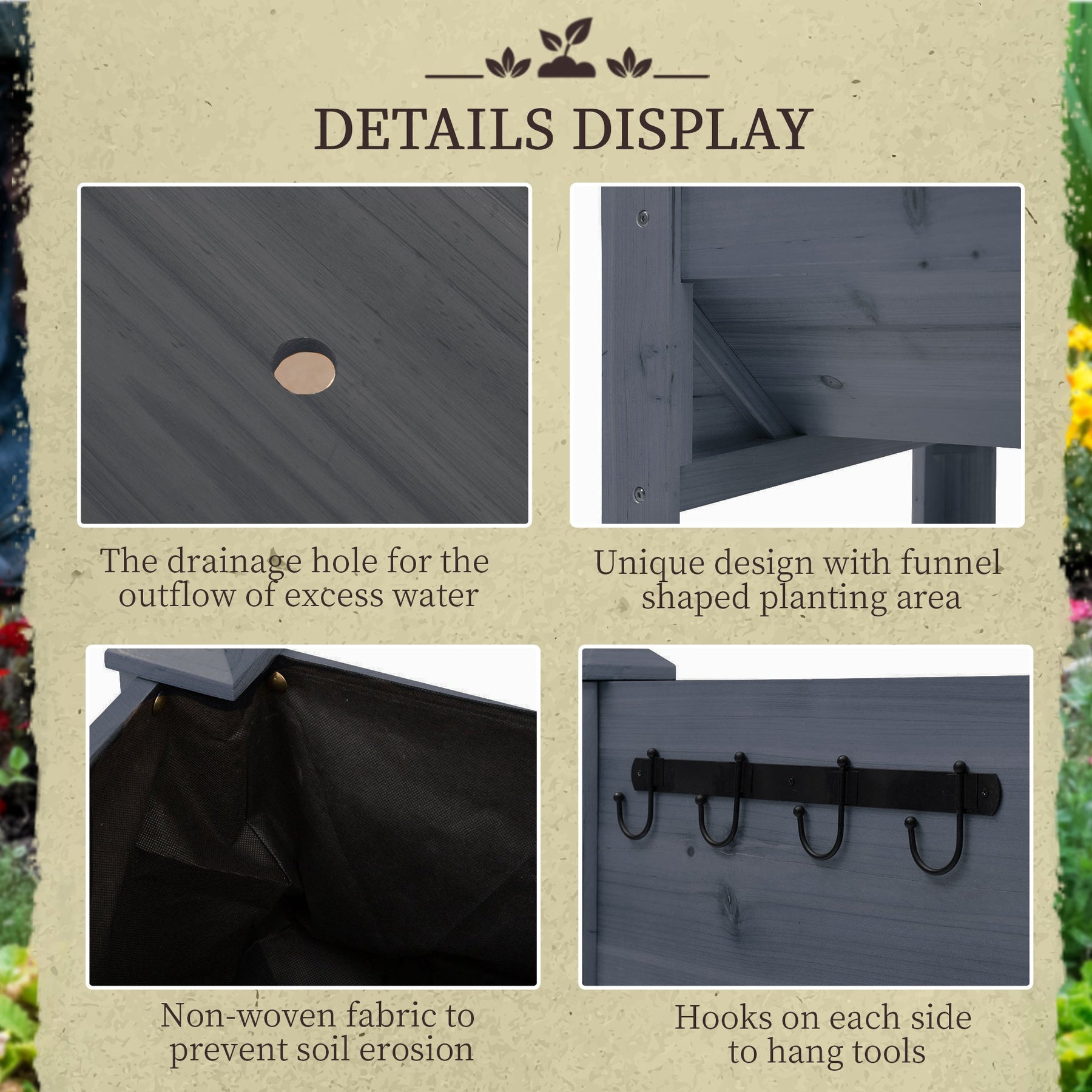 Transform your outdoor space with this practical and stylish raised garden planter. Featuring a funnel-shaped planting area, it provides ample space to grow flowers, vegetables, and herbs. The planter's design ensures excess water drains away through a bottom hole, preventing waterlogging, while the non-woven fabric protects against soil erosion. Made from high-quality fir wood, this raised bed is durable, stable, and treated with outdoor water-based paint for weather resistance. Additionally, it features four hooks on the side for easy access to small gardening tools. Perfect for patios, backyards, or gardens, this elevated planter makes gardening more convenient and accessible.