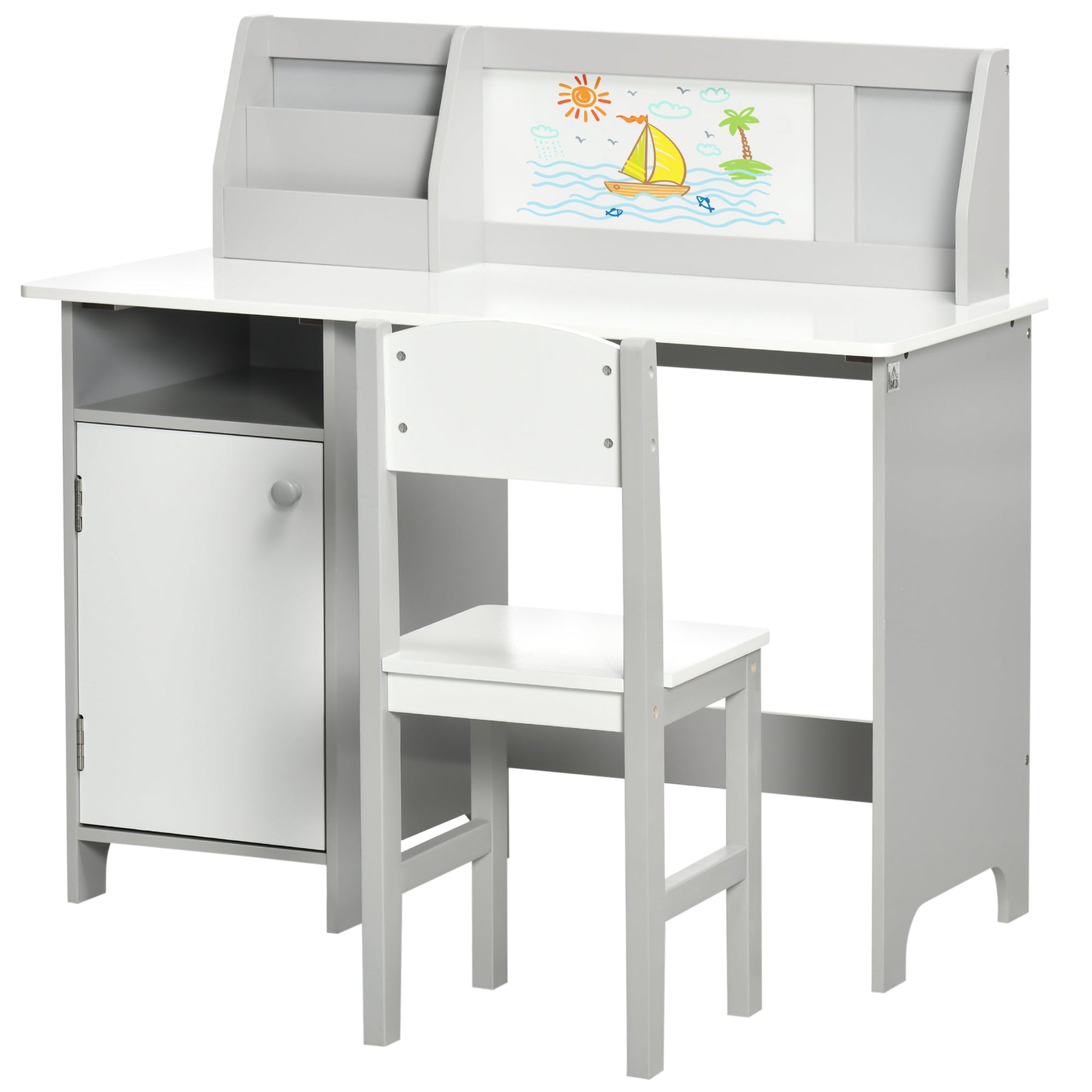 Qaba 2Pcs Kids Desk Chair Set with Whiteboard Storage Shelves Study Furniture Grey