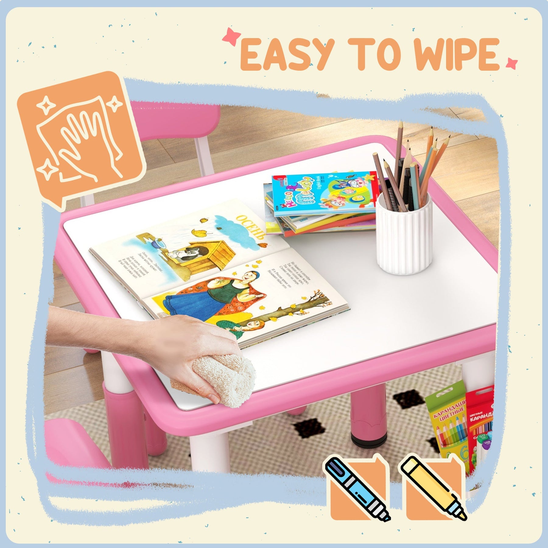 This 5-piece kids' table and chair set is the perfect solution for growing children, offering plenty of space for tea parties, board games, coloring, and other creative activities. Designed with adjustable height, this set can easily adapt to your child's needs, ensuring it lasts as they grow from ages 1.5-5 years. The set includes one large table and four chairs, with chairs that can be tucked neatly under the table to save space in smaller rooms. Additionally, a storage box attached to the table legs helps keep toys, art supplies, and other essentials organized and easily accessible. Perfect for playrooms, classrooms, and more, this sturdy set is built to handle up to 110 lbs per table/chair.