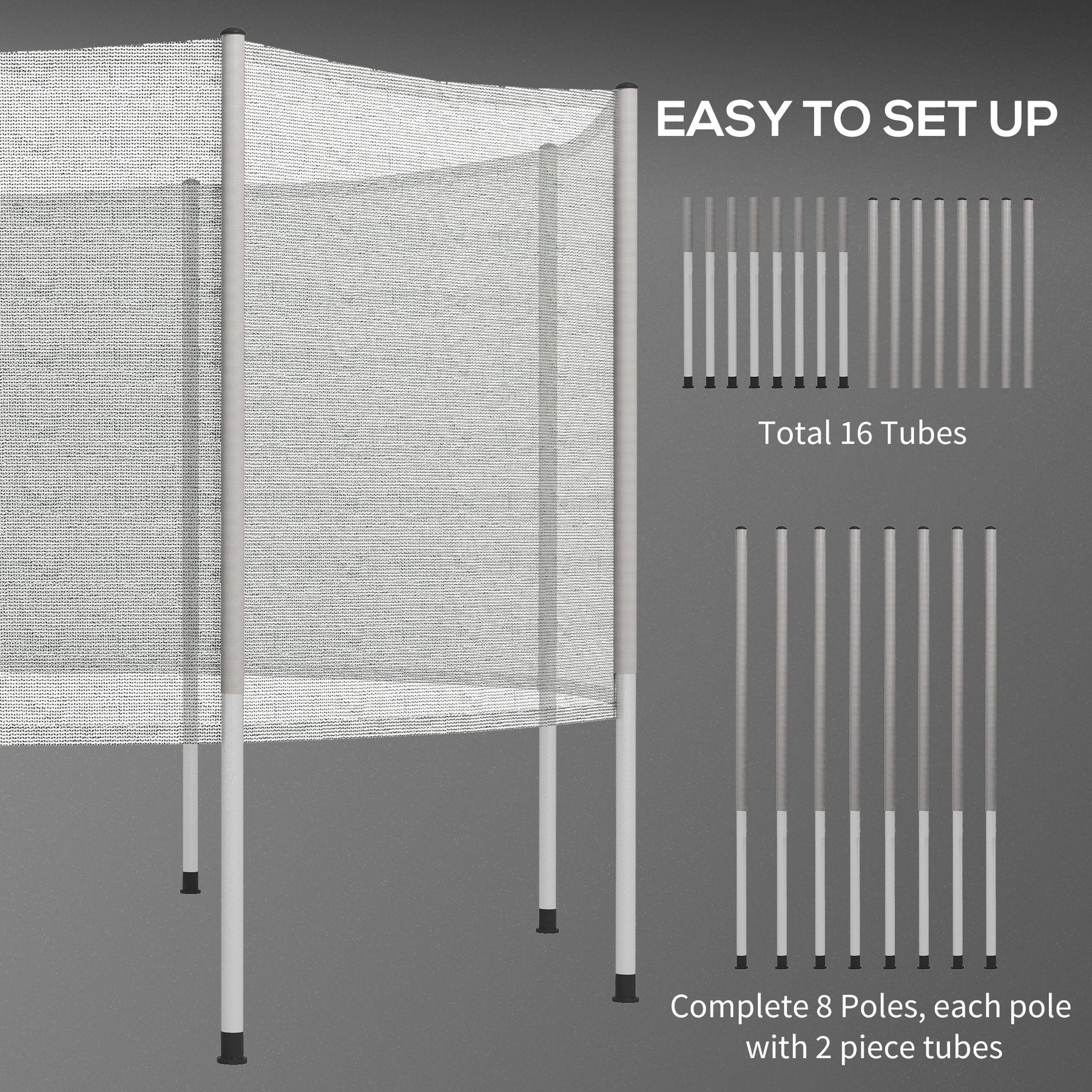 Easy Setup: Includes 8 poles with 2-piece tubes (16 tubes total) for easy installation. Simply follow the included instructions.