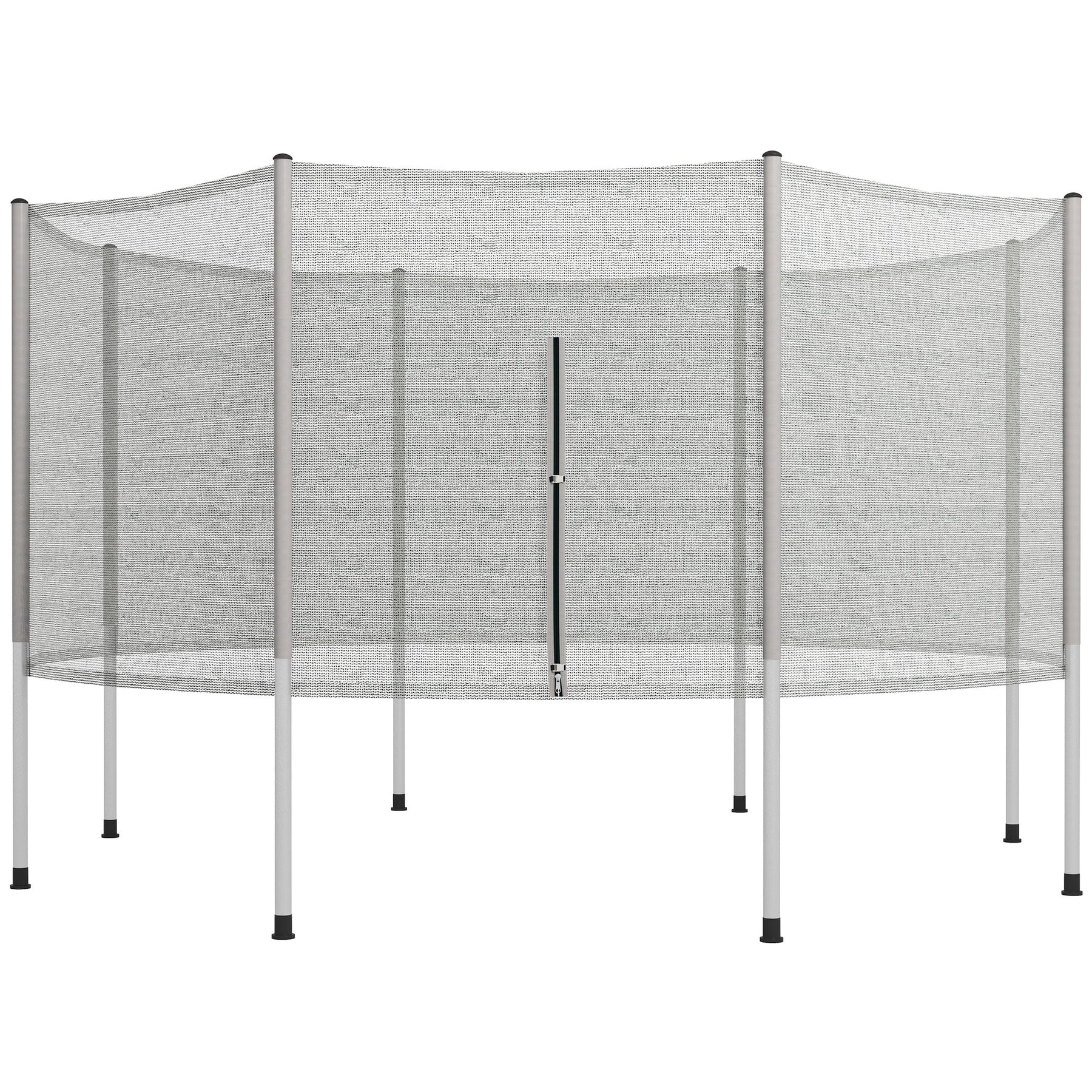 Ensure safe and fun jumping with this 14FT trampoline protection net enclosure! Designed to fit 14FT trampolines, this net provides added security by connecting between the trampoline pad and jumping mat, preventing your child from falling out during play. Made with high-quality UV-resistant terylene, the net is durable and built to withstand the elements. The included 8 poles, each with 2-piece tubes, are easy to assemble—just follow the simple instructions. The net features a dual-closure entry with both a zipper and buckles, offering easy access, while the foam-padded frame poles provide additional safety. Note: Trampoline not included.