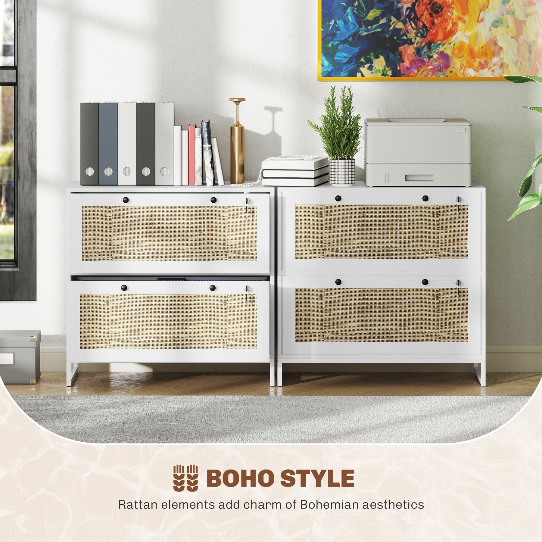 Stay organized and secure with this stylish filing cabinet designed to meet both your storage and aesthetic needs. Featuring five file partition bars, with the middle bar adjustable within a 10cm slot, this cabinet accommodates letter, A4, or legal-size folders for efficient document storage. The spacious countertop offers additional space for a printer, keeping your office essentials neatly in place. Prioritizing security, each drawer is equipped with a lock and two keys, ensuring your important documents are safe and easily accessible only to you. The cabinet’s unique boho style showcases rattan panels on the drawers and bronze alloy round handles, adding a touch of Bohemian charm to your office space. Handmade with natural rattan, the design not only looks great but also absorbs moisture and heat, contributing to a comfortable and inviting atmosphere. Crafted from melamine-faced particleboard, this office cabinet is easy to clean and can support up to 22 lbs (10 kg) on the tabletop. It combines function with style to keep your office organized and your documents secure.