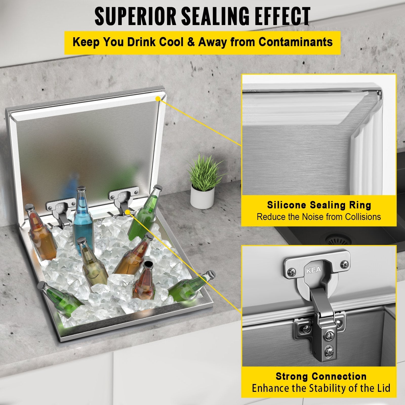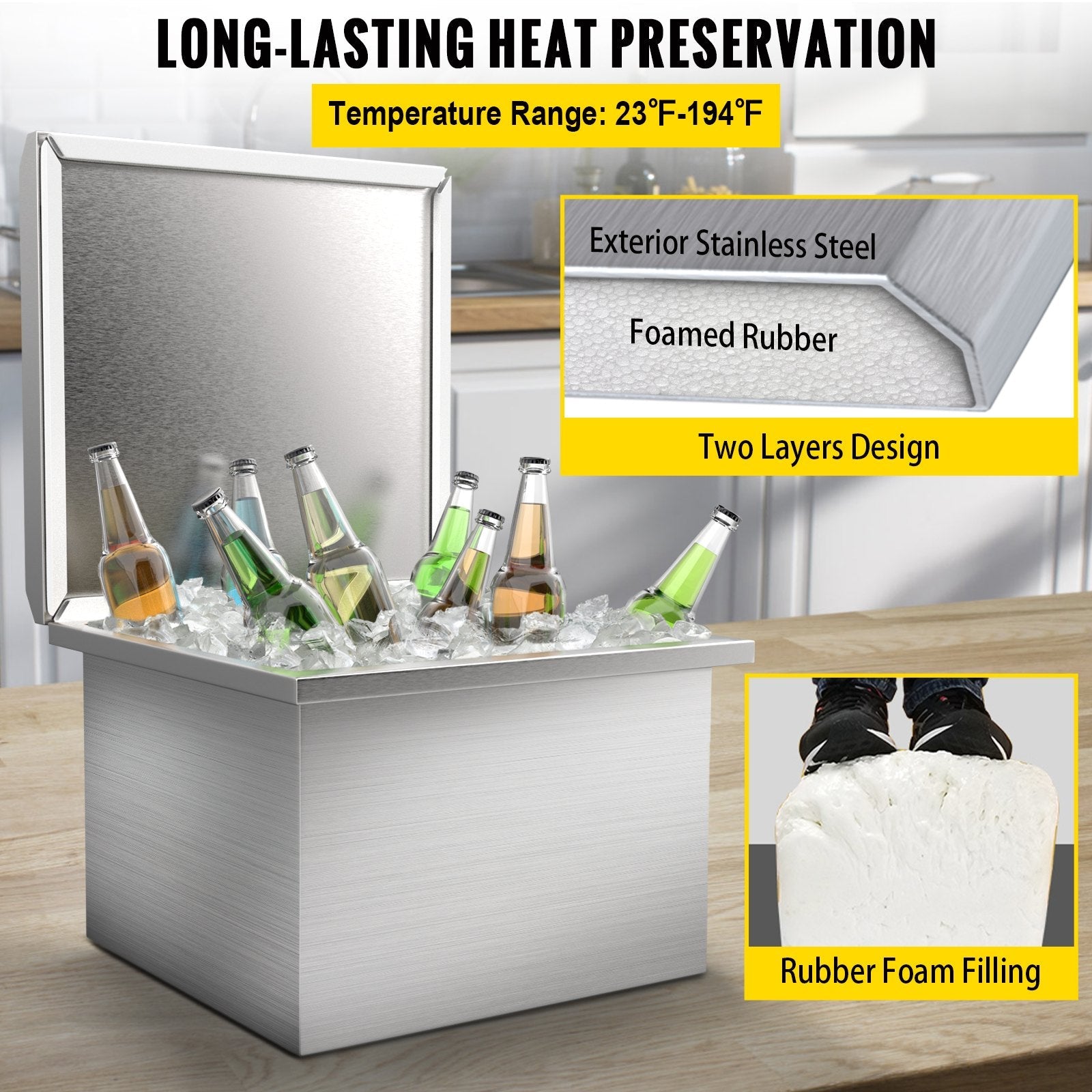 VEVOR Drop in Ice Bin Chest 20x16 inch Drop in Cooler Stainless Steel Outdoor Drop in Ice Chest with Cover Bar Ice Bin 40.9 qt Drop in Wine Drops Drain-Pipe and Drain Plug Included for Cold Wine Beer