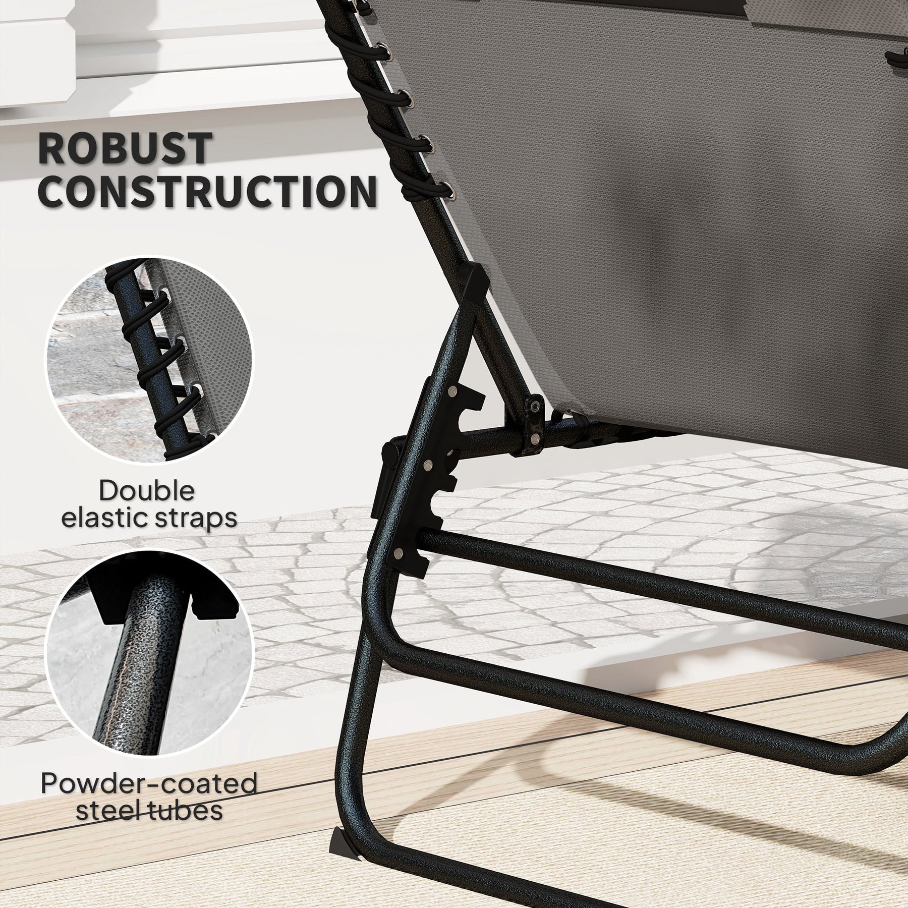 Relax and unwind with this versatile 5-level reclining patio lounger set. Designed for ultimate comfort and convenience, each chair is adjustable up to 180 degrees, allowing you to find the perfect reclining angle. The double elastic straps provide additional pressure-relieving comfort, making it ideal for sunbathing or taking a nap. When not in use, these loungers fold up for space-saving storage and easy transport, complete with a carrying handle for added convenience. A side pocket is included for storing magazines, keeping everything you need within arm’s reach. The quick-drying 3D mesh pad and breathable fabric ensure comfort even after getting wet, while the head pillow adds an extra touch of luxury. Built with robust powder-coated steel tubes, these loungers offer excellent stability and can support up to 264 lbs (120 kg).