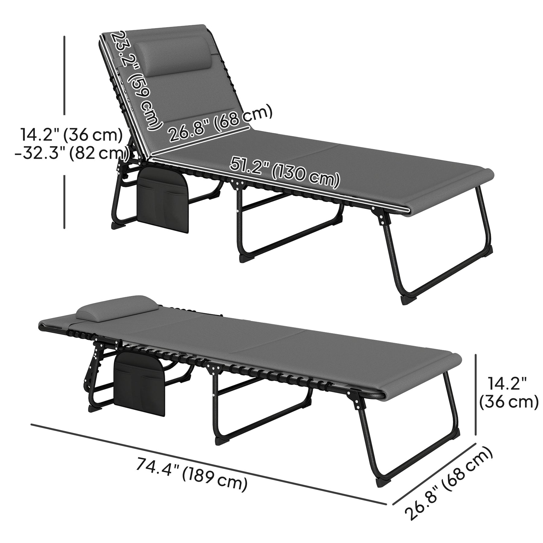 Folding Outdoor Chaise with Pocket: Foldable for easy storage and transport, with a convenient side pocket to store magazines.