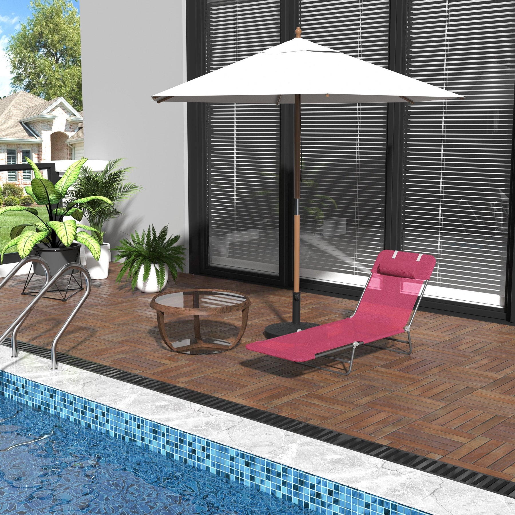 Relax in style and comfort with this foldable outdoor chaise lounge chair. Featuring a 6-level adjustable backrest with an integrated head pillow, you can customize your lounging position from sitting upright to fully reclining (0-180°). Constructed with a lightweight steel frame, this chair supports up to 264 lbs while remaining portable and easy to carry for outdoor adventures. The quick-dry mesh fabric is perfect for poolside, patio, or garden use, offering both comfort and durability. When not in use, simply fold the chair for convenient, compact storage, saving space and making transportation a breeze.