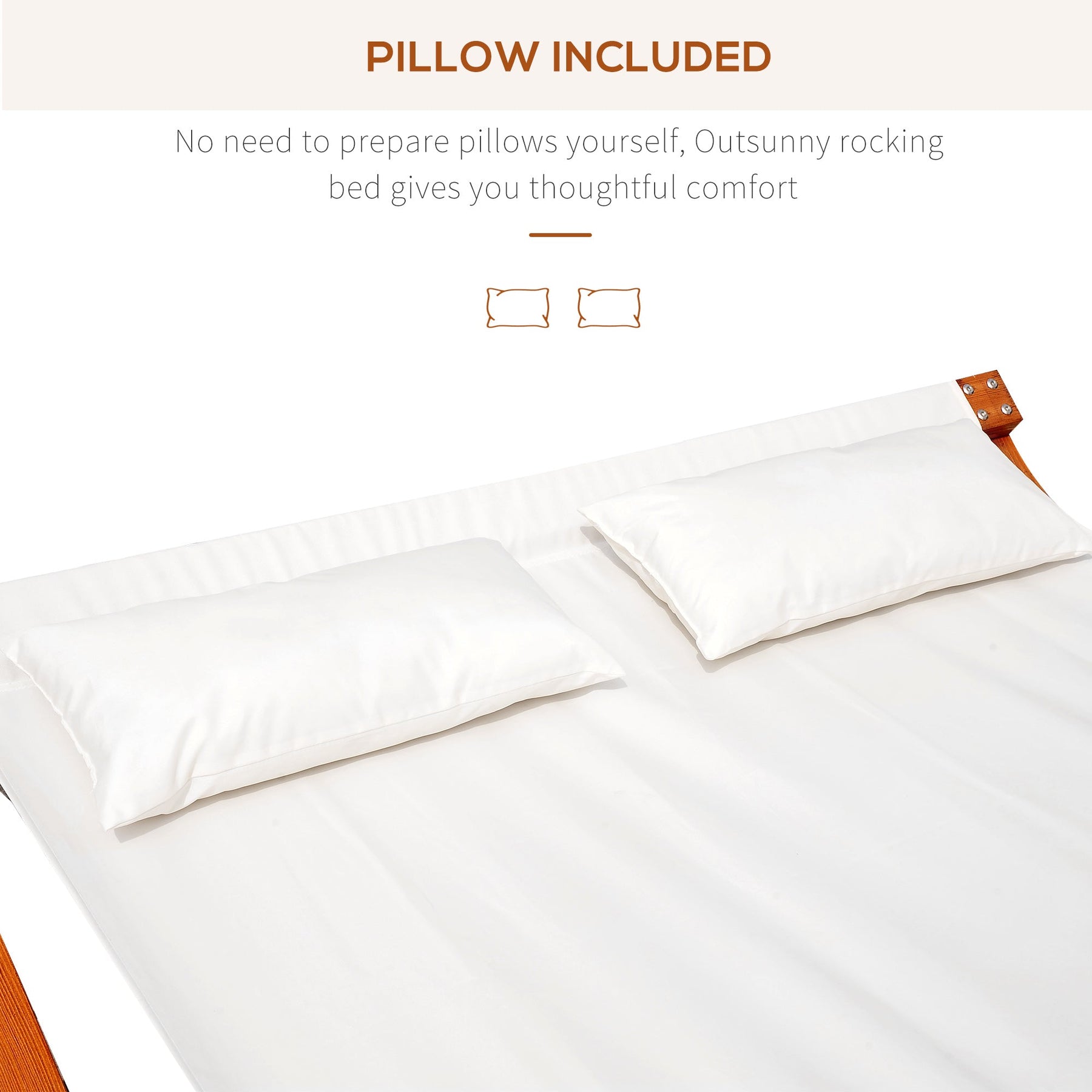 Relax in style with this Relaxing Rocking Bed, designed to provide a soothing back-and-forth motion for ultimate relaxation. The curved wooden frame offers a smooth rocking experience, perfect for lounging outdoors. Made with 240 gsm 100% cotton fabric, the sun lounger delivers breathability and soft comfort, keeping you cool even on warm days. Its spacious design accommodates two people, offering a generous 440 lbs. (200 kg) weight capacity—ideal for couples or lounging with friends. Complete with two removable pillows, this bed provides extra support for your head, enhancing your comfort and relaxation.