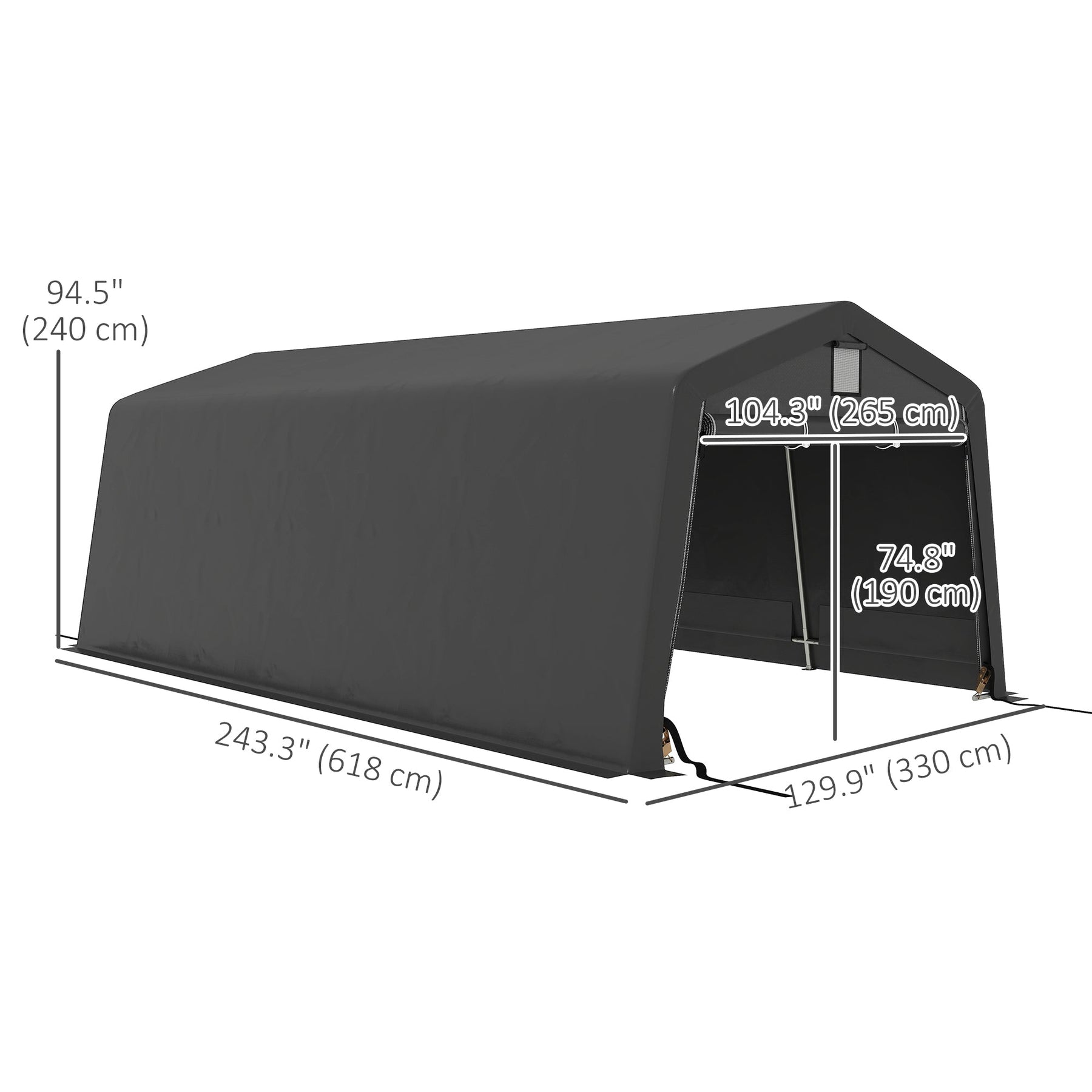 Enjoy versatile outdoor protection with this Car Port or Party Canopy, perfect for sheltering vehicles or hosting outdoor events such as wedding receptions, graduation parties, and barbecues. Designed to shield cars from dirt, debris, light rain, and UV rays, this car canopy offers a spacious and protective area for multiple uses. The large zippered door provides easy access, while two ventilation windows ensure proper airflow throughout the year. The outer curtains can be rolled up or down for added convenience. Equipped with a ratchet cover tension system and web strap components, this carport maintains a secure and neat appearance. Built with thick galvanized steel pipes, it offers exceptional durability, preventing cracking, peeling, and rust. The extended edges and ground stakes add extra stability, ensuring the structure stands firm in various conditions.