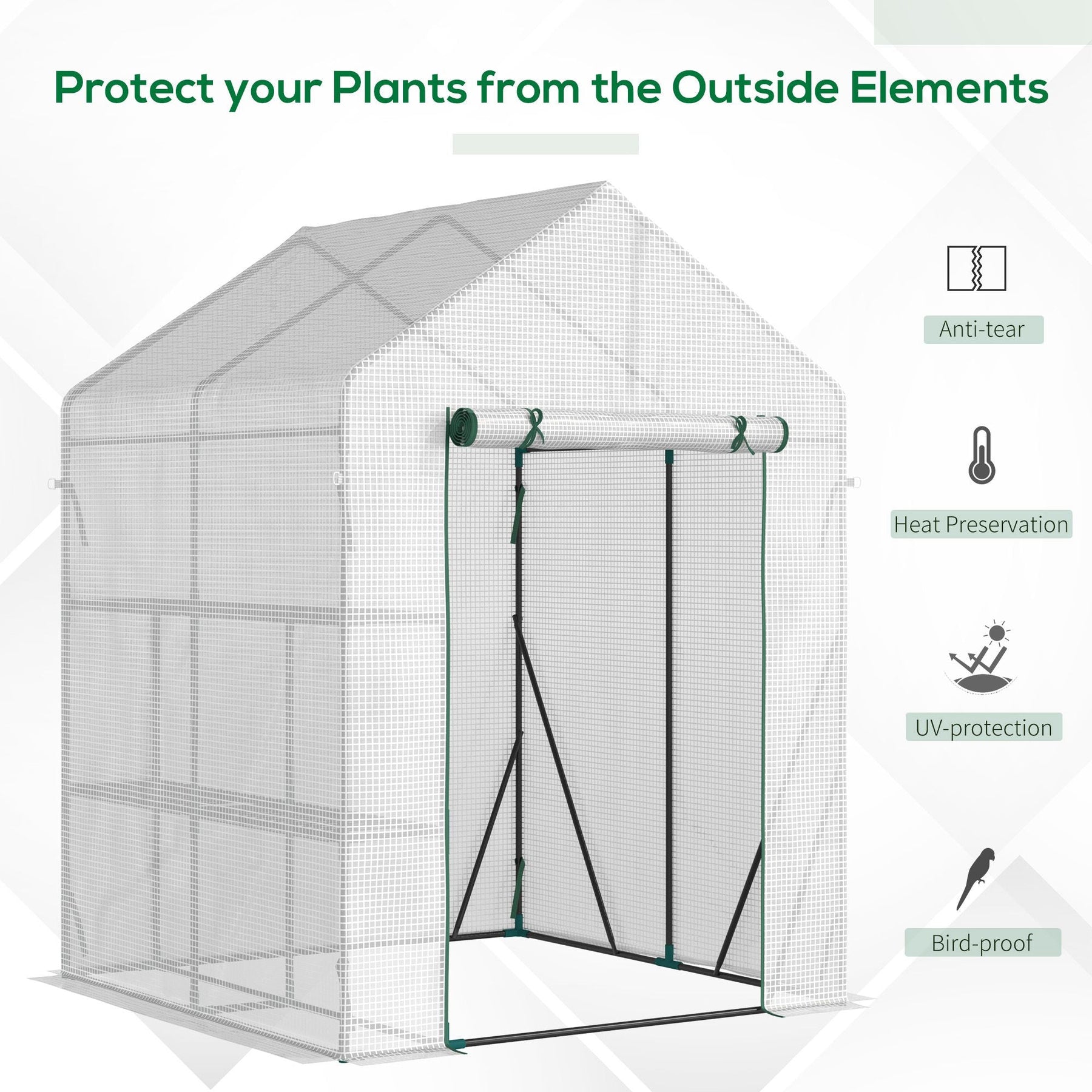 Create the perfect environment for your plants to thrive year-round with this compact and efficient outdoor greenhouse. Designed to extend your growing season, this greenhouse provides vital protection from cold temperatures, wind, and birds, making it ideal for nurturing seedlings, young plants, and even tropical greenery. The fully enclosed UV-protective PE cover maintains high humidity levels while allowing ample sunlight to filter through, promoting vigorous growth. A zippered roll-up door ensures easy access to your plants and makes moving gardening tools in and out a breeze. Inside, multiple wire shelves offer ample space for plant storage and ventilation, supporting healthy plant development. The durable metal frame provides stability, and for enhanced support, the 3.9" edging can be buried in soil and secured with guy ropes and ground stakes to form a tight seal. Whether you’re an experienced gardener or a beginner, this greenhouse makes gardening easier, more efficient, and more successful.
