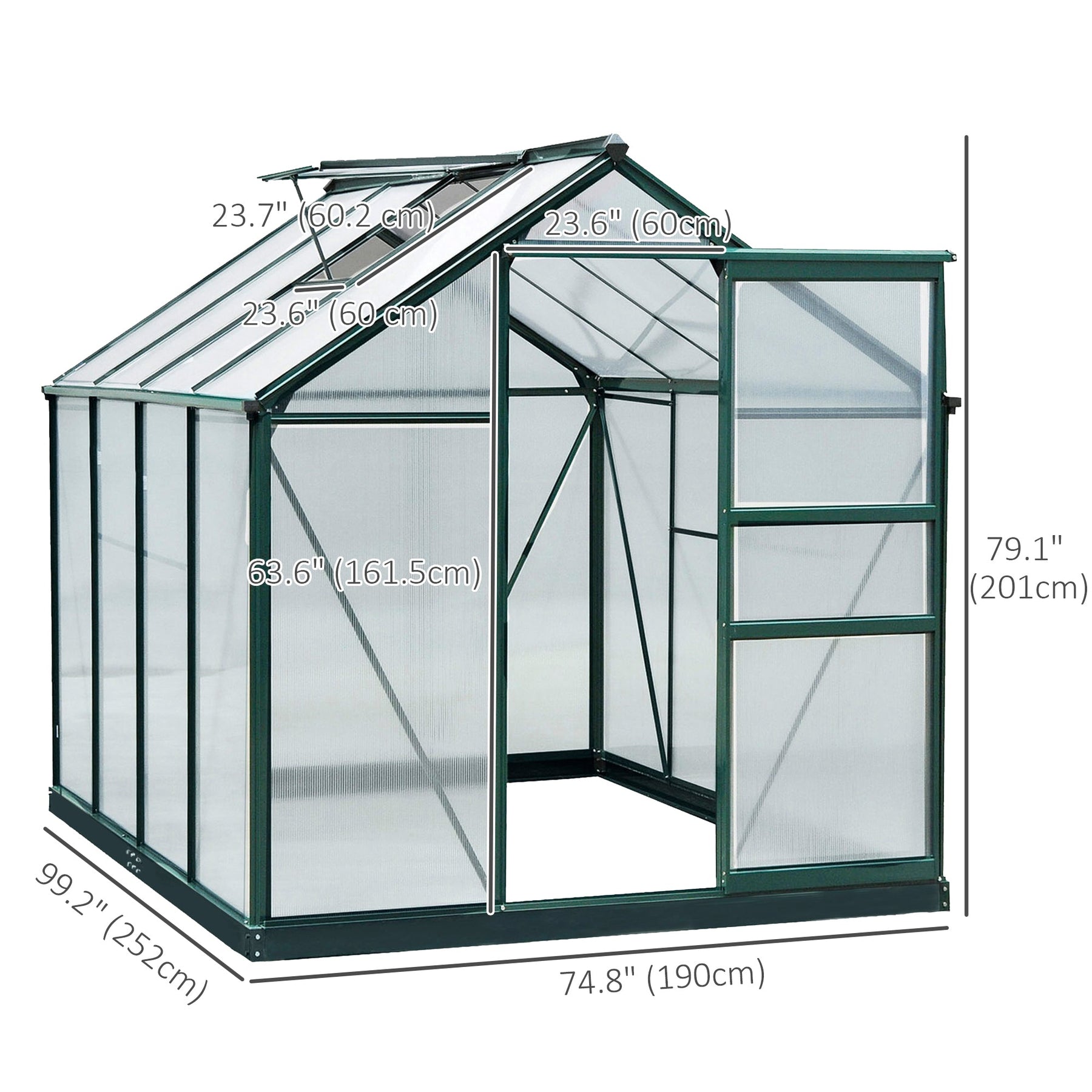 Enjoy gardening in any season with the Outsunny Polycarbonate Walk-In Greenhouse, designed to offer a protected and stable environment for your plants year-round. This versatile outdoor greenhouse features durable polycarbonate sheets that allow natural sunlight to nourish your plants while shielding them from harsh weather. Its sturdy construction includes a powder-coated aluminum alloy frame and a galvanized base that provide a solid and long-lasting foundation. The smooth sliding door ensures easy entry and is made from the same tough material as the greenhouse walls for seamless protection. Ventilation is key for plant health, and the built-in rooftop vent panel delivers just that—helping to regulate airflow and internal temperature. Ideal for growing vegetables, flowers, and herbs, this walk-in greenhouse is perfect for backyards and patios. Please note: This greenhouse is not intended to withstand extreme weather conditions such as heavy snow or strong winds, so seasonal care and setup are recommended.