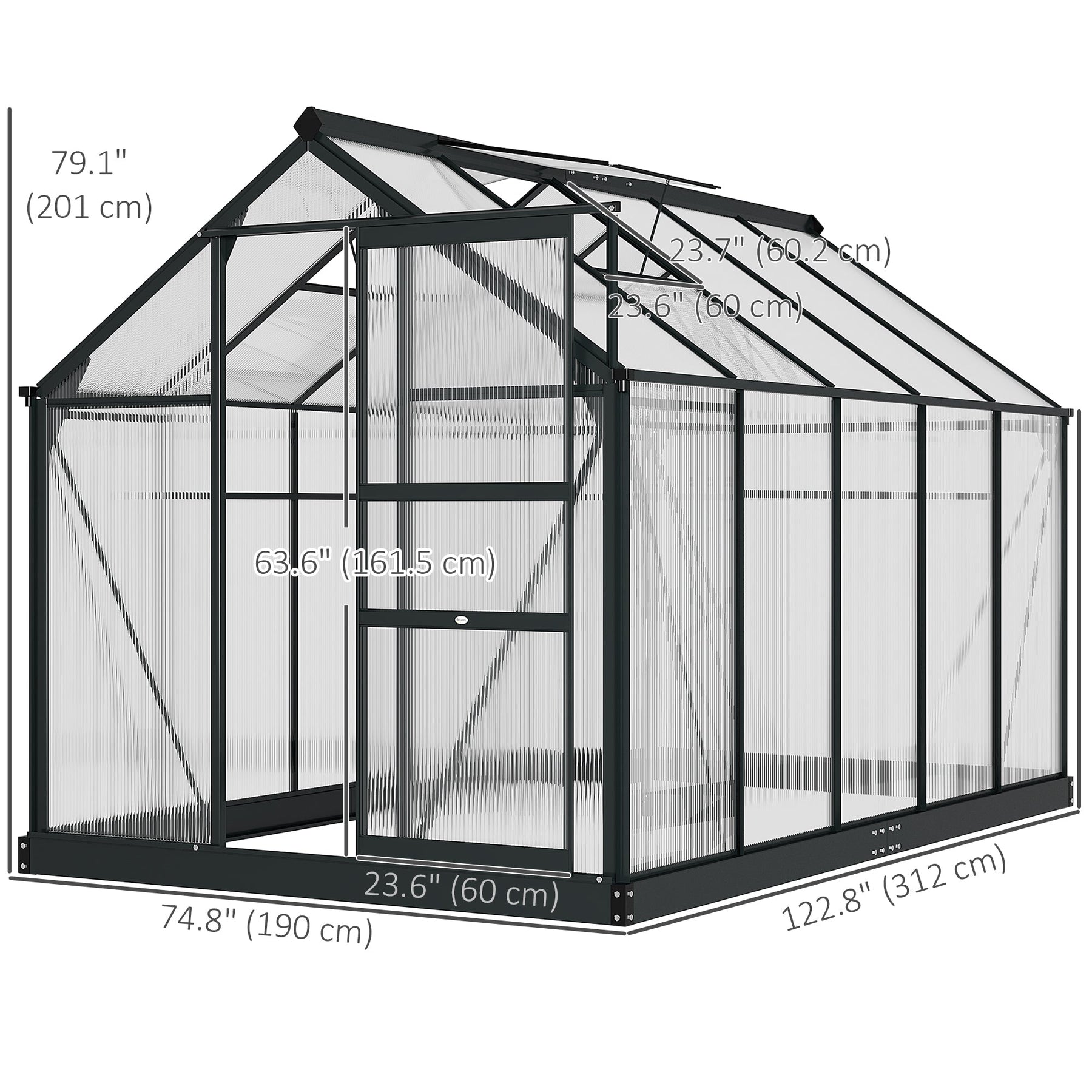 Extend your gardening season year-round with the Outsunny polycarbonate walk-in greenhouse, designed to provide a stable and protective environment for your plants in any season. Featuring durable polycarbonate sheets, this greenhouse shields plants, vegetables, and flowers from harsh weather conditions while allowing ample sunlight to pass through for healthy growth. Its sturdy powder-coated aluminum alloy frame and galvanized sheet base offer exceptional stability and longevity. The practical sliding door design ensures easy entry and is constructed from the same robust material as the rest of the structure. Two hinged rooftop vent panels allow for proper air circulation, helping to regulate temperature and humidity within the greenhouse. Designed for efficiency and convenience, this greenhouse offers a well-ventilated, weather-resistant space for gardening enthusiasts. However, please note that it is not designed to withstand extreme weather conditions such as heavy snow.