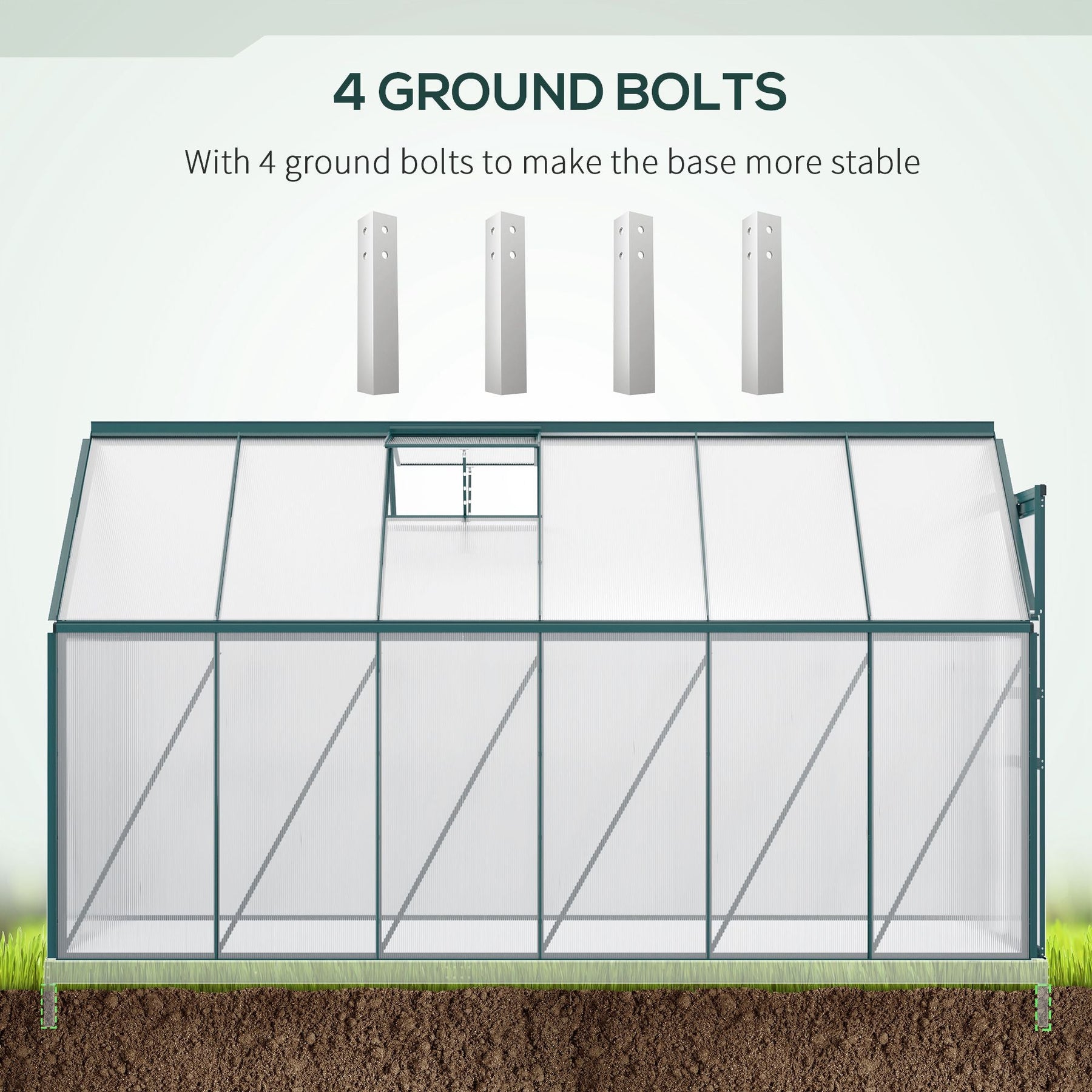Enjoy year-round gardening with this spacious walk-in polycarbonate greenhouse, designed to shield plants from cold weather while providing optimal growing conditions for vegetables, fruits, herbs, and flowers. Built with a solid aluminum alloy frame and a galvanized steel base, this outdoor greenhouse ensures long-lasting durability and reliable support. It comes with four 4.7" (12 cm) ground bolts and an additional 2.8" (7 cm) bolt for enhanced stability. The transparent polycarbonate panels are UV-resistant, effectively retaining heat while allowing natural sunlight to pass through for healthy plant growth. The snap-in connection between PC panels simplifies assembly, making setup more convenient. For easy access, this greenhouse features a smooth sliding door, while five-level adjustable windows provide excellent ventilation control. Additionally, integrated rain gutters ensure proper water drainage and collection, helping to maintain the right moisture balance. Please note that this greenhouse is not designed to withstand extreme weather conditions such as heavy snow.