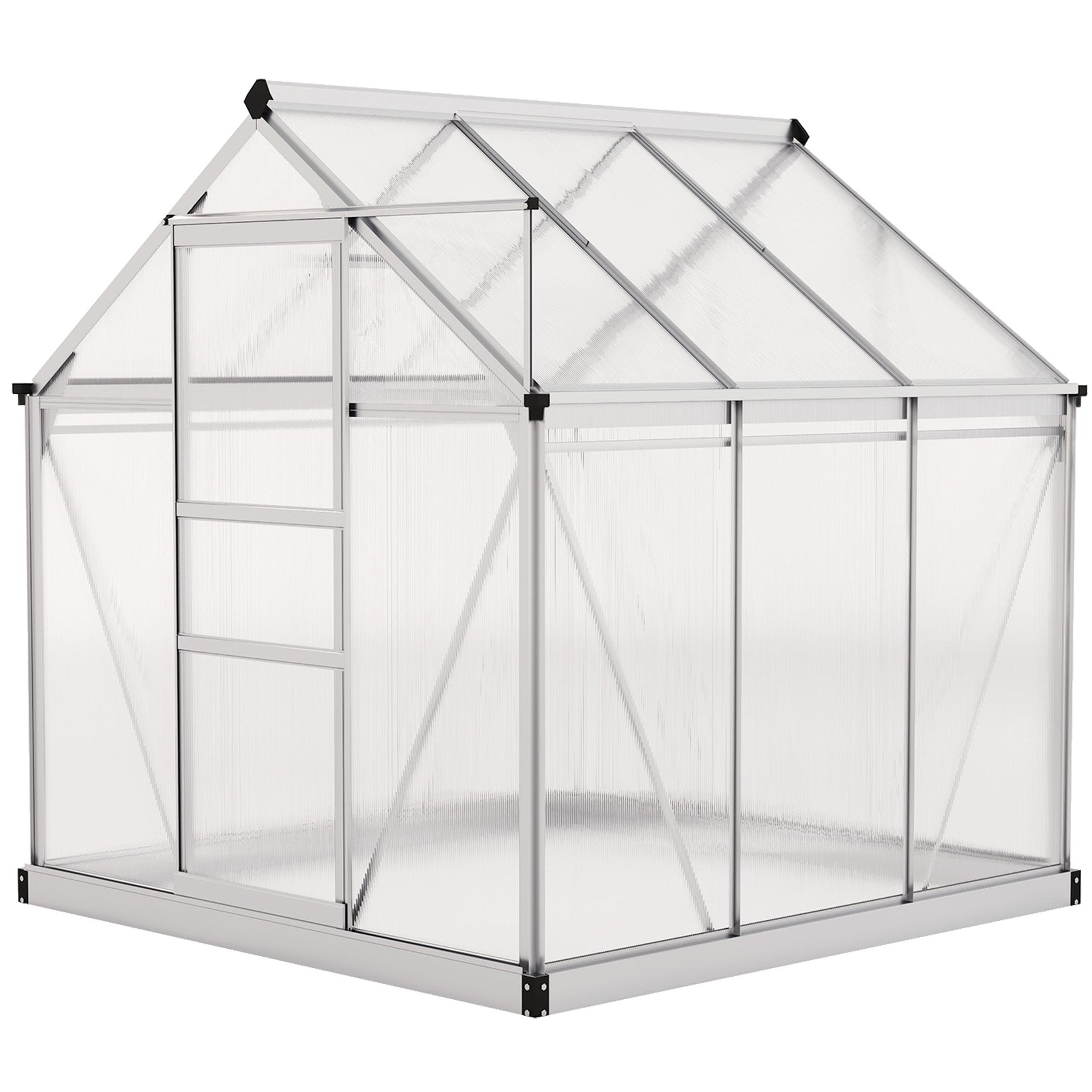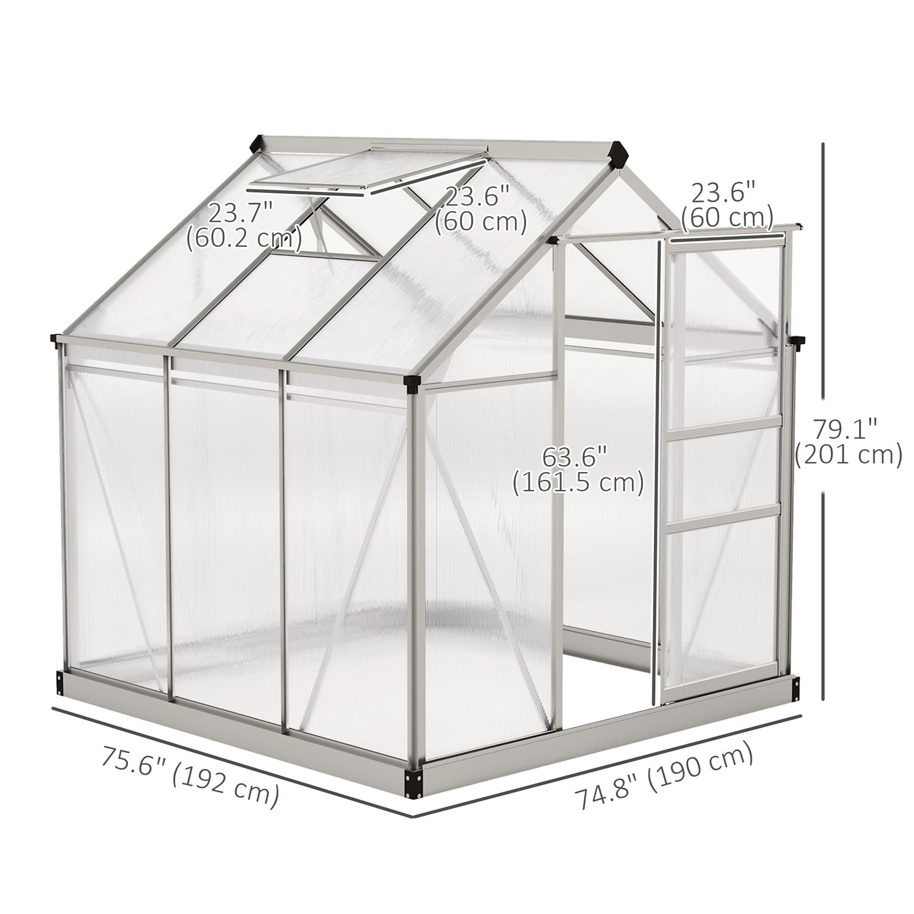 Create the perfect environment for year-round gardening with our Outsunny polycarbonate walk-in greenhouse. Designed to protect and nurture your plants in all seasons, this greenhouse provides a stable and controlled growing space. Its durable polycarbonate sheets shield your plants from harsh weather while allowing ample natural light to pass through, ensuring optimal growth conditions. The heavy-duty powder-coated aluminum alloy frame and galvanized sheet base enhance stability and longevity, making it a reliable addition to any backyard or garden. Featuring a smooth sliding door, this greenhouse allows easy access without taking up extra space. For improved airflow and temperature regulation, the rooftop vent panel ensures proper ventilation, promoting healthy plant growth. Please note that while this greenhouse is built to endure various weather conditions, it is not designed to withstand extreme conditions such as heavy snow.