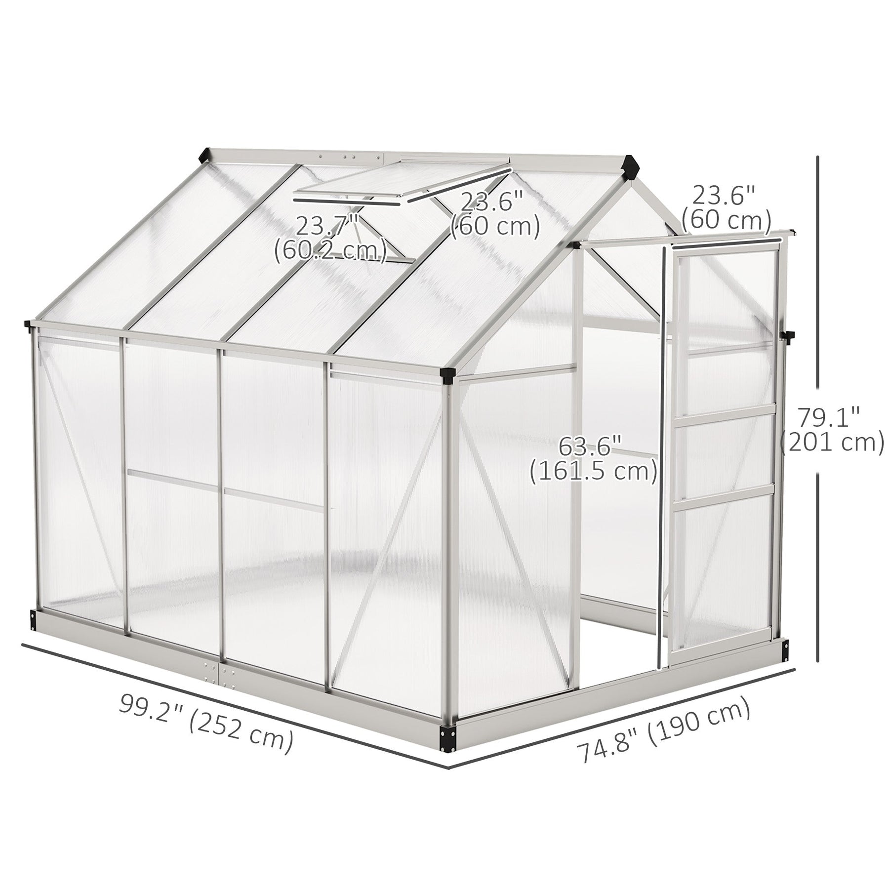 Enjoy year-round gardening with the Outsunny polycarbonate walk-in greenhouse, designed to create a stable and controlled environment for your plants. Whether you're growing vegetables, flowers, or herbs, this greenhouse offers a reliable space to protect and nurture your plants through every season. The high-quality polycarbonate sheets effectively shield plants from harsh weather while allowing ample natural light to penetrate, ensuring optimal growth. Constructed with a heavy-duty powder-coated aluminum alloy frame and a galvanized sheet base, this greenhouse is built for durability and stability. The convenient sliding door allows for easy access while maintaining the structure’s integrity. For improved airflow and temperature regulation, the rooftop vent panel provides necessary ventilation to support healthy plant growth. With a spacious walk-in design, this greenhouse is perfect for gardening enthusiasts looking to extend their growing season. Please note that while this greenhouse offers excellent protection, it is not designed to withstand extreme weather conditions such as heavy snow.