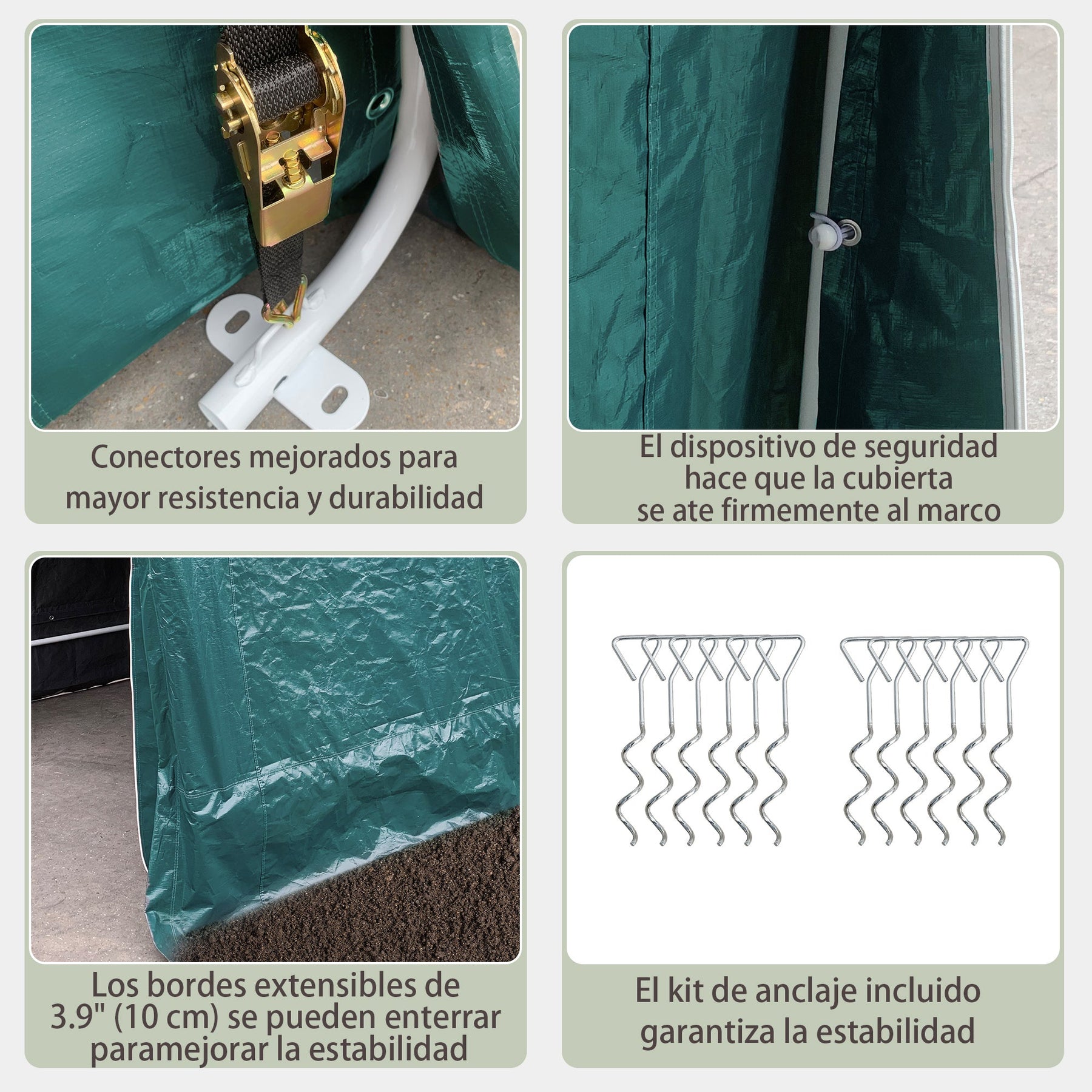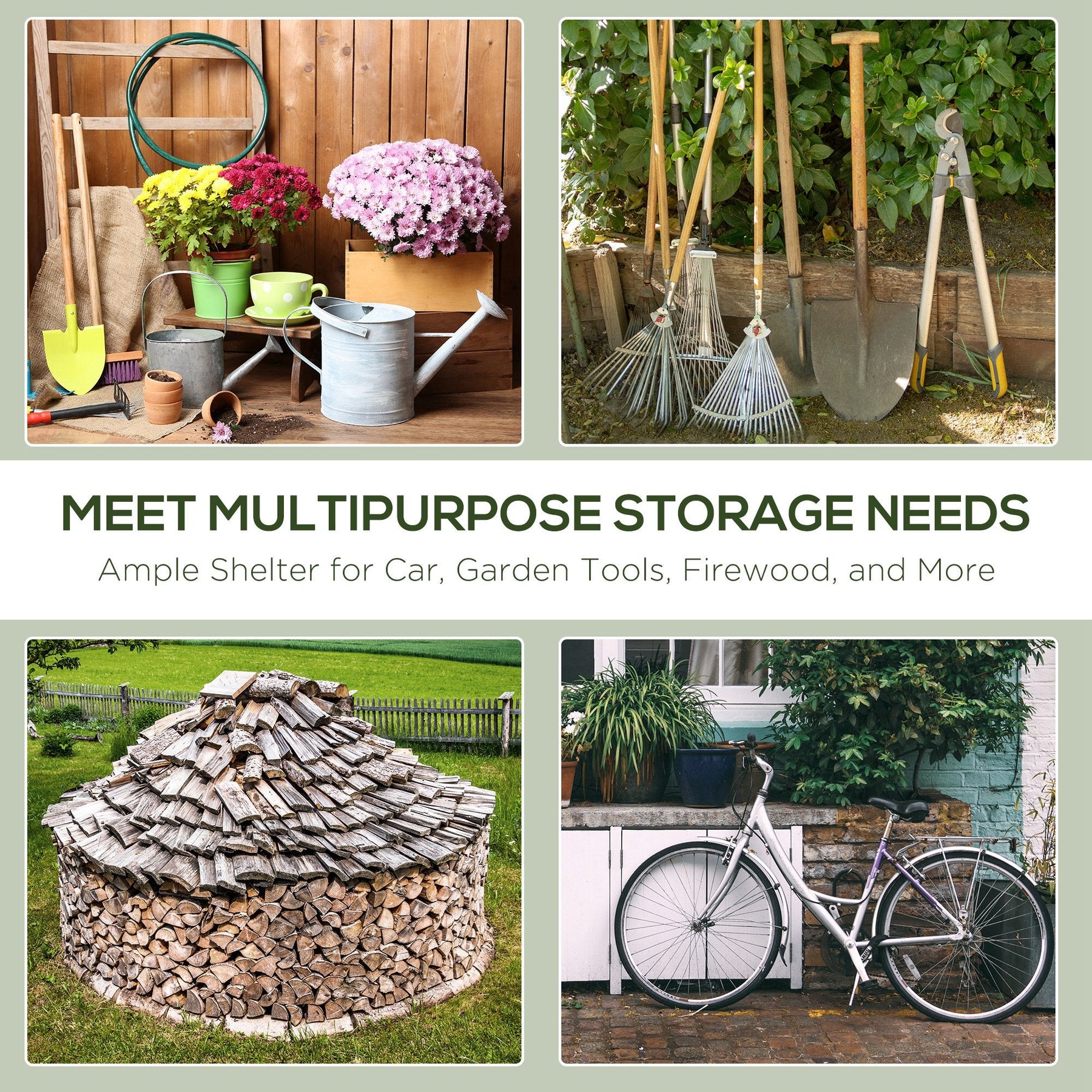 This outdoor carport shed offers a reliable and durable storage solution with its heavy-duty metal frame that resists deformation, ensuring long-lasting support. The coated poles and enhanced connectors provide sturdy and stable support to meet your storage needs effectively. The seamless design includes an integrated top cover and sidewalls, securely attaching to the frame for enhanced stability and superior protection for your stored items. The shed also features convenient double-zippered roll-up doors, making it easy to access your belongings. These doors can be fastened from both inside and outside with clasps for added security. Enhanced stability is provided by ground stakes, extended edges, and ratchet straps that tighten the cover to keep it securely attached. Quick and easy to assemble, this carport shed offers both functionality and protection for your items.