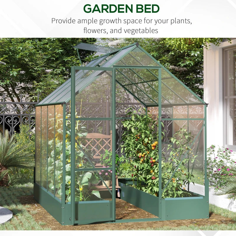 Upgrade your gardening experience with our advanced greenhouse, complete with dual raised beds for 28.8 sq.ft. growing space, a bright roof window for optimal climate control, and a green elevated foundation frame for added value.