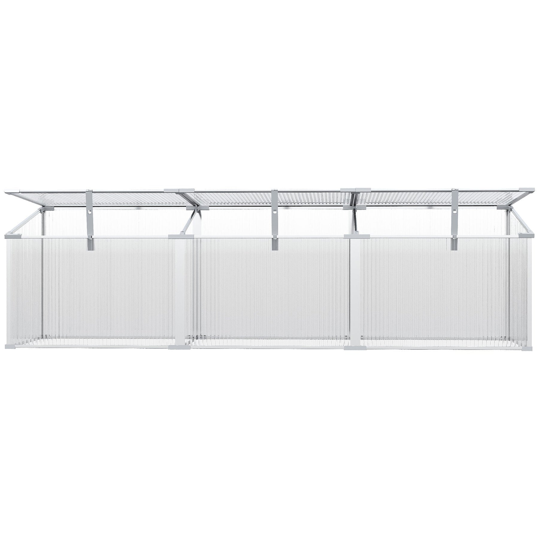 Maximize your plant growth with this outdoor greenhouse, designed to provide optimal light and warmth for your plants. The transparent polycarbonate panels allow for maximum light transmission while retaining heat, making it perfect for early seed sprouting and protecting plants during the colder seasons. The adjustable roof features 3-level openings (up to 6") that allow for proper ventilation and easy access to your plants. It can be opened 180° to create a flat top surface or opened fully for complete access. The lightweight aluminum frame and rust-resistant hardware ensure long-lasting durability, and the greenhouse helps protect your plants from squirrels and other small animals, keeping your hard work safe. With a peak height of over 20", this greenhouse provides ample space for your plants to grow and prepare before planting them outdoors.