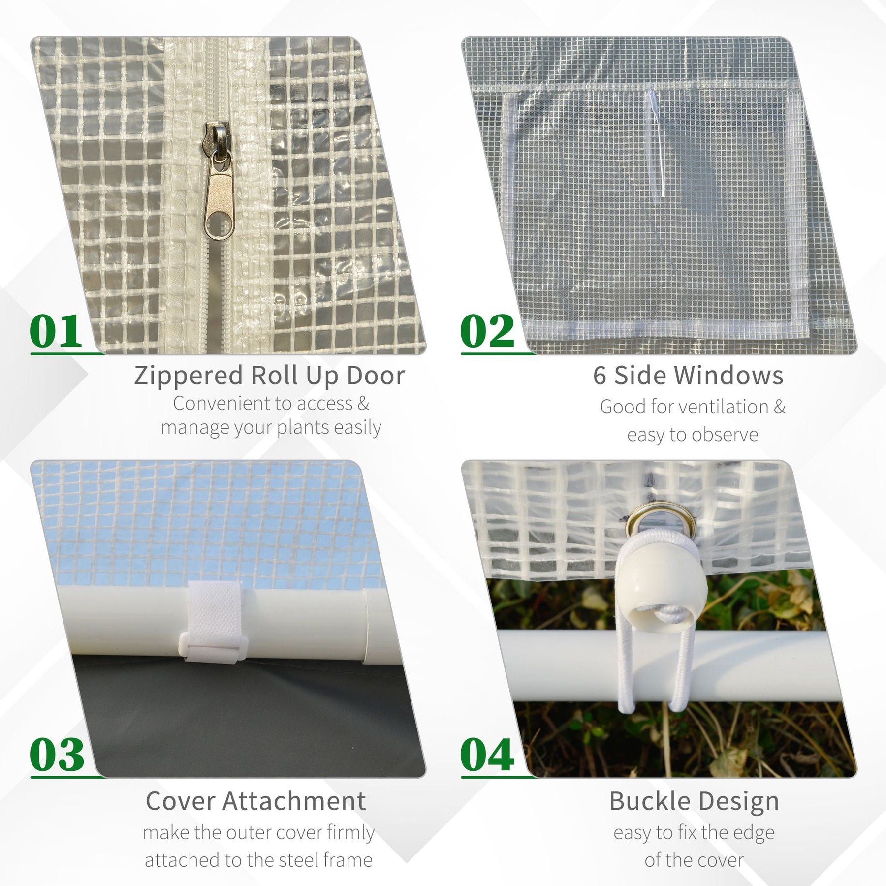 Extend your growing season and protect your plants from cold, wind, light rain, and birds with the Large Walk-In Greenhouse. This outdoor garden greenhouse is designed to create the ideal environment for your plants. Featuring two zippered roll-up doors at the front and back, you can easily access and transport plants or gardening tools. With 6 roll-up windows, the greenhouse promotes better air circulation and provides convenient observation windows to monitor plant growth. The fully enclosed, waterproof, and UV-resistant PE cover ensures that high humidity levels are maintained for tropical plants, while still allowing nourishing sunlight to pass through. The 15 cm extended edges of the cover should be buried in the soil for added stability and protection against rainwater accumulation. Built with a sturdy, powder-coated steel frame, the greenhouse offers excellent durability, while the included guy ropes and ground nails ensure it stays securely in place. With generous dimensions of 19.7'L x 9.8'W x 9.2'H, this greenhouse is perfect for gardeners looking to maximize their outdoor space.