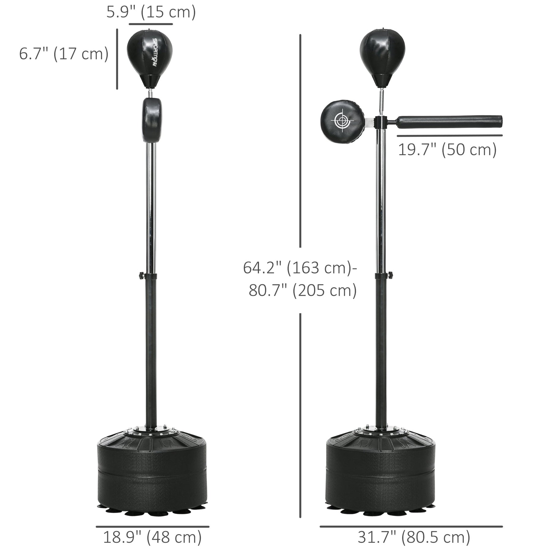 Overall Dimensions: 31.7" L x 18.9" W x 64.2"-80.7" H (80.5 x 48 x 163-205 cm). Speed Ball Size: 6'' Dia. x 6.75'' D (15 x 17 cm).