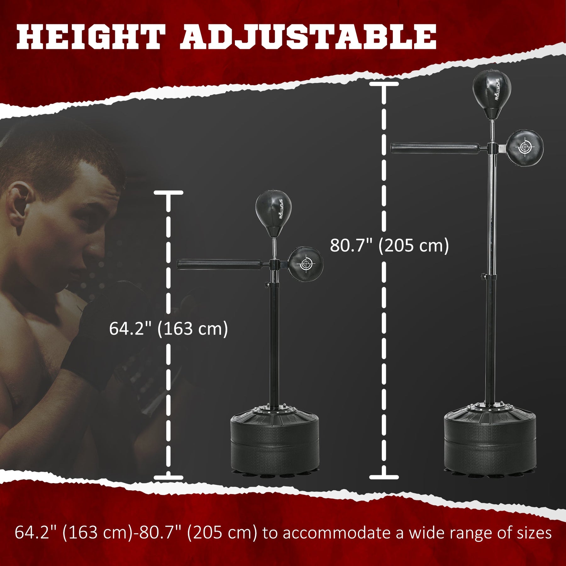 Enhance your boxing training with this speed ball set, designed to improve reaction time, accuracy, and agility. The 360° reflex bar allows you to simulate sparring scenarios by dodging, reacting, and punching back, providing a dynamic and realistic workout experience. The adjustable height (64.25" to 80.75") accommodates users of various sizes, including teenagers, adults, and professional athletes. The stable base can be filled with sand or water, providing extra support and stability, while 12 suction cups underneath ensure the reflex bag stays firmly in place during use. Wraps are included to protect your fists during training.