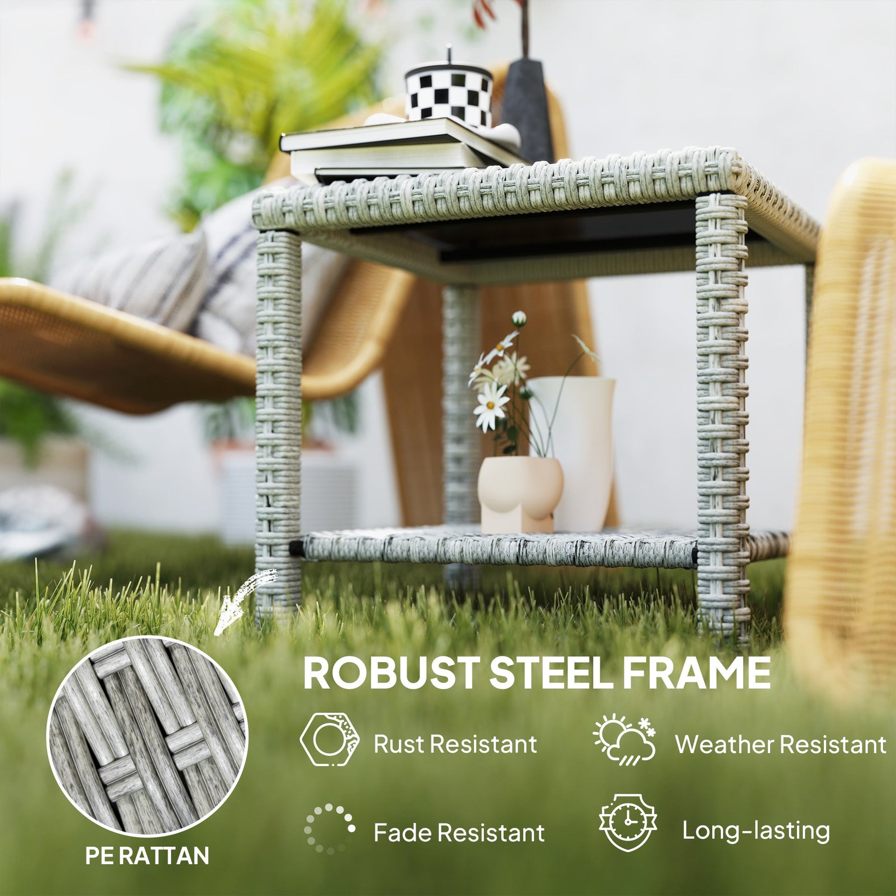 Elevate your home or garden decor with this elegant rattan outdoor coffee table, designed to seamlessly blend into both indoor and outdoor settings. Featuring a sleek and stylish rattan design, this coffee table adds a touch of sophistication to your patio, living room, or any space. It comes with a stable 0.2" (0.5 cm) tempered glass top that not only enhances the table's durability by resisting impacts and scratches but also makes cleaning a breeze with a simple wipe-down. The coffee table offers a convenient double-layer shelf, perfect for storing daily essentials like books, magazines, or remote controls, helping keep your space tidy and organized. Built with a powder-coated steel frame, this table ensures long-lasting stability and durability, with protective feet for added support. Whether you're hosting guests on your patio or enjoying a cozy evening indoors, this table provides both functionality and style.