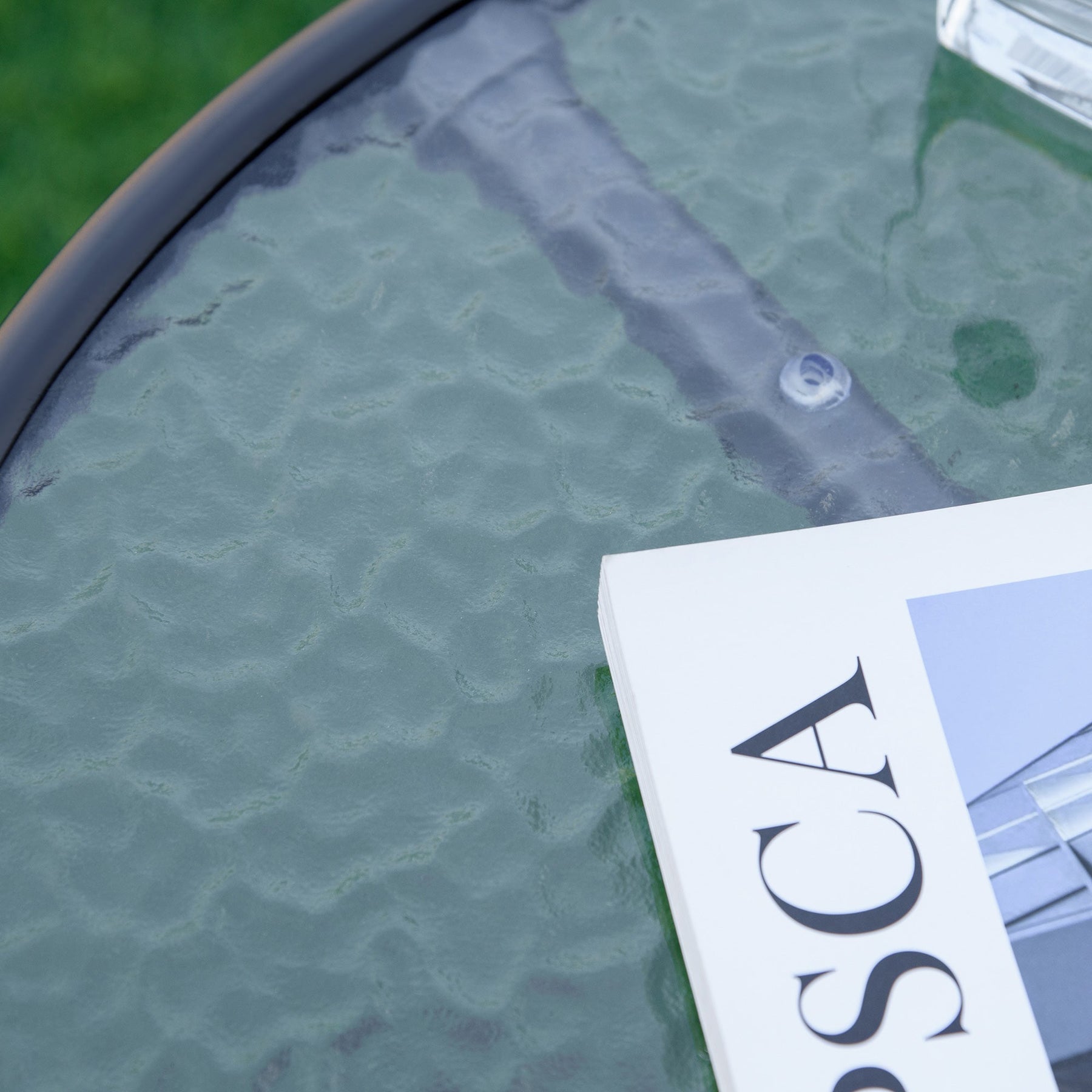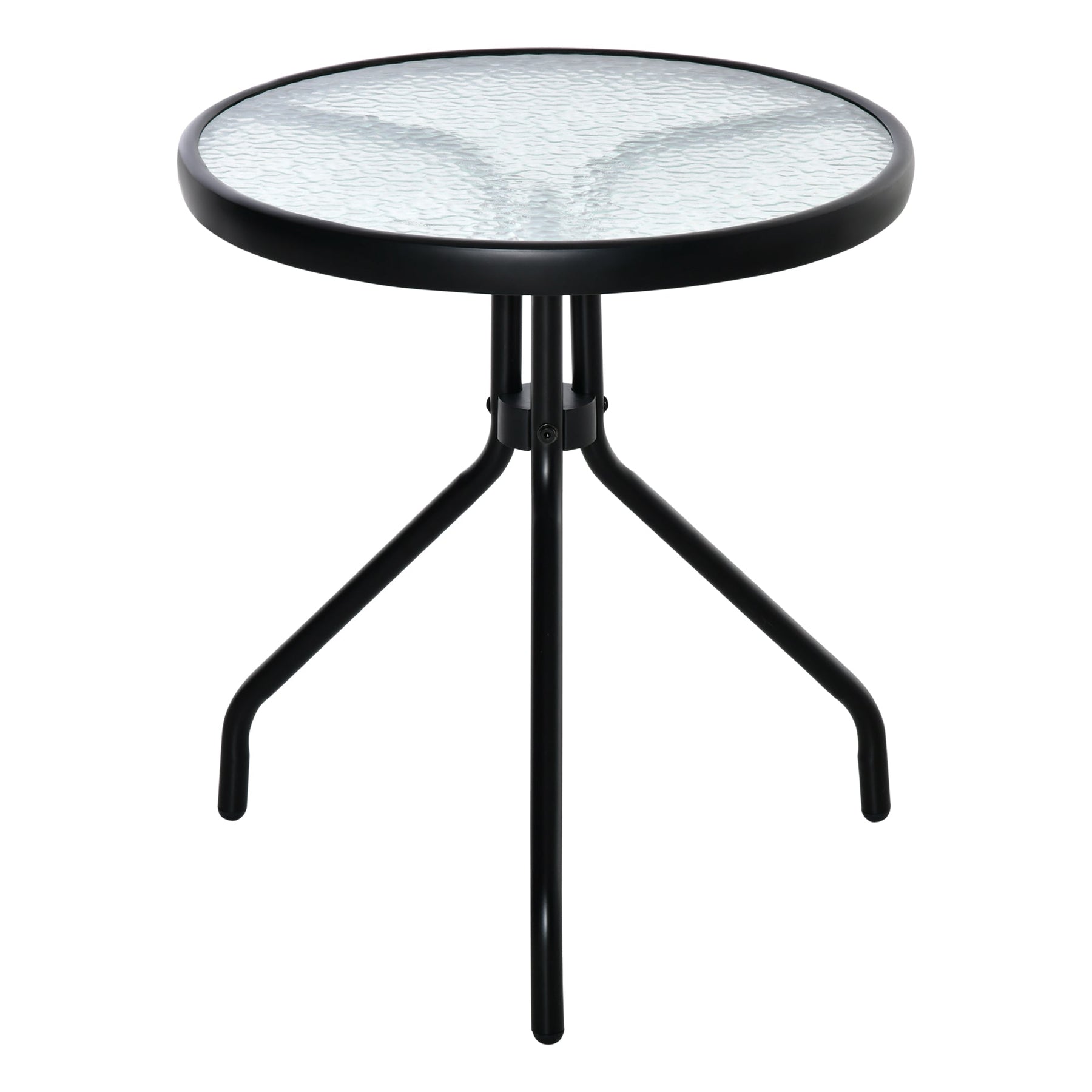 This elegant outdoor side table combines black metal with clear tempered glass featuring a water wave pattern, offering a stylish and sleek addition to your patio décor. Its round design makes it a versatile piece for any balcony or small garden space. Built with a powder-coated metal frame and strong three-legged support, along with a 5mm thick tempered glass tabletop, this table is designed for durability and resistance to outdoor elements. Its smooth surface makes cleaning easy, keeping it looking great for years.